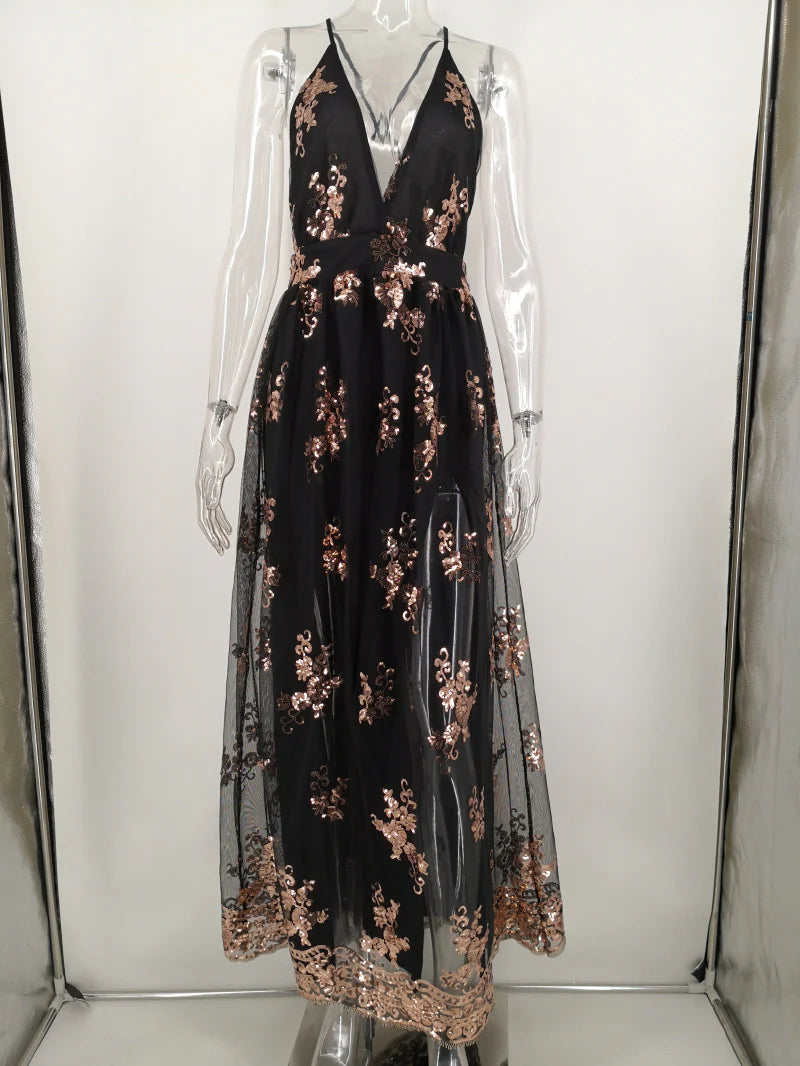 Adorned with lush velvet floral detailing on a delicate mesh overlay. this beautiful dress is designed with a flattering plunging neckline and a daring open cross-back. Perfect for your next formal event. it is sure to make you the center of attention. For a chic look. pair it with nude glam makeup. high heels. and a matching mini handbag.