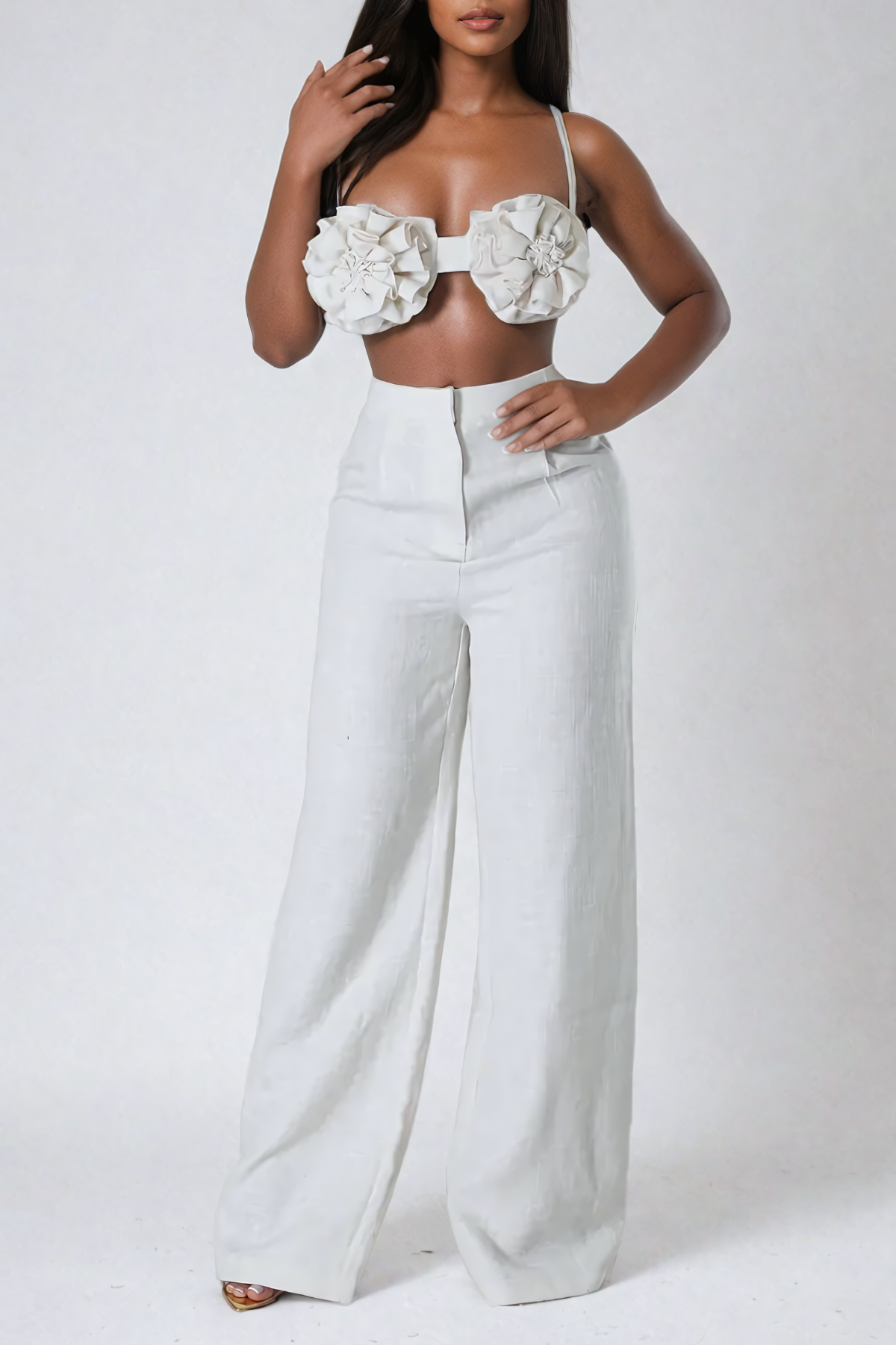Experience comfort and style with our Aero Flower Spaghetti Pants Set. Made with lightweight and breathable fabric. it is perfect for everyday wear. The spaghetti straps and flowy pants will keep you feeling cool and chic. This white set is a versatile addition to your wardrobe.