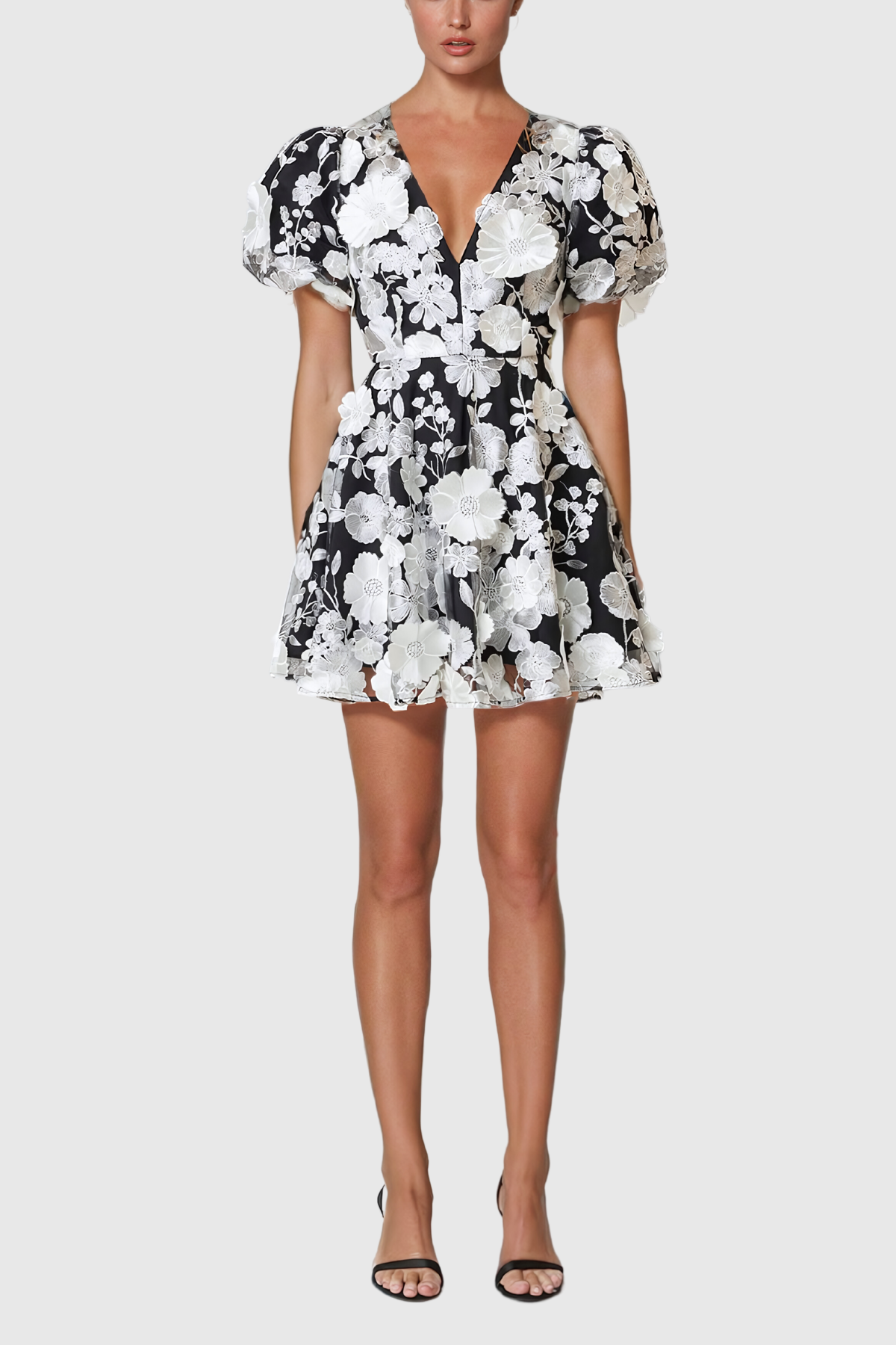Elevate your style with the Aeryn Flower Plunge Lace Mini Dress. Made with delicate lace. this dress features a flattering plunging neckline and a mini length. perfect for showing off those legs. Enhance your femininity and make a statement at any occasion with this stunning piece.
