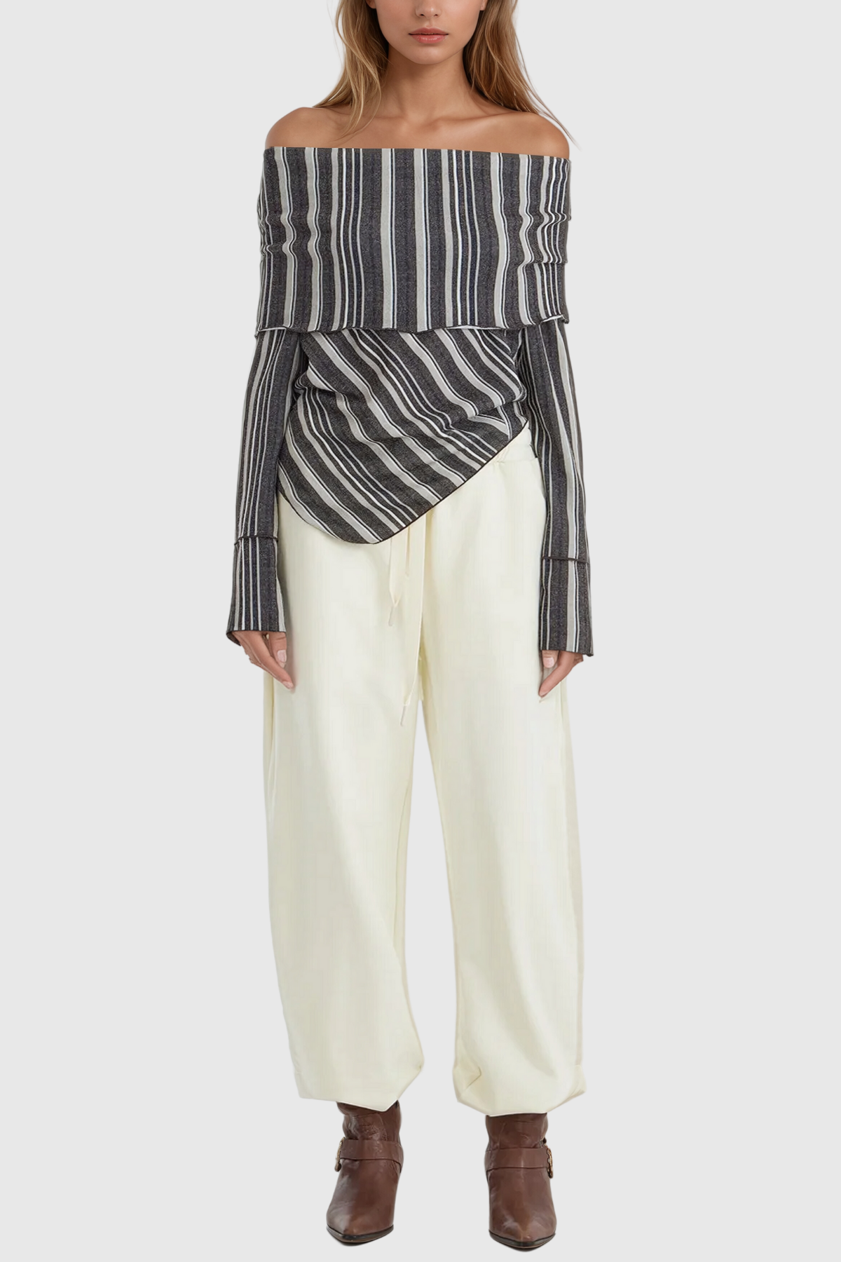 Expertly designed for ultimate comfort and style. the Agata Off Shoulder Stripe Top is a must-have addition to any wardrobe. Made with a soft and breathable fabric. this top features an off shoulder design and classic stripes for a timeless look. Perfect for any occasion. it effortlessly combines fashion and function.