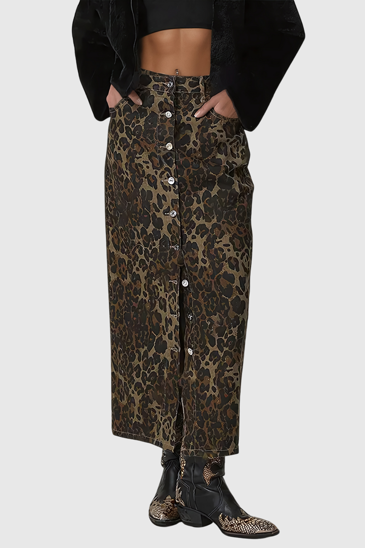Expertly crafted with high-quality denim. the Agim Leopard Button Skirt is a must-have for fashion-forward women. The bold leopard print and chic button detailing add a touch of sophistication to this versatile piece. Elevate your wardrobe with this stylish and durable skirt.