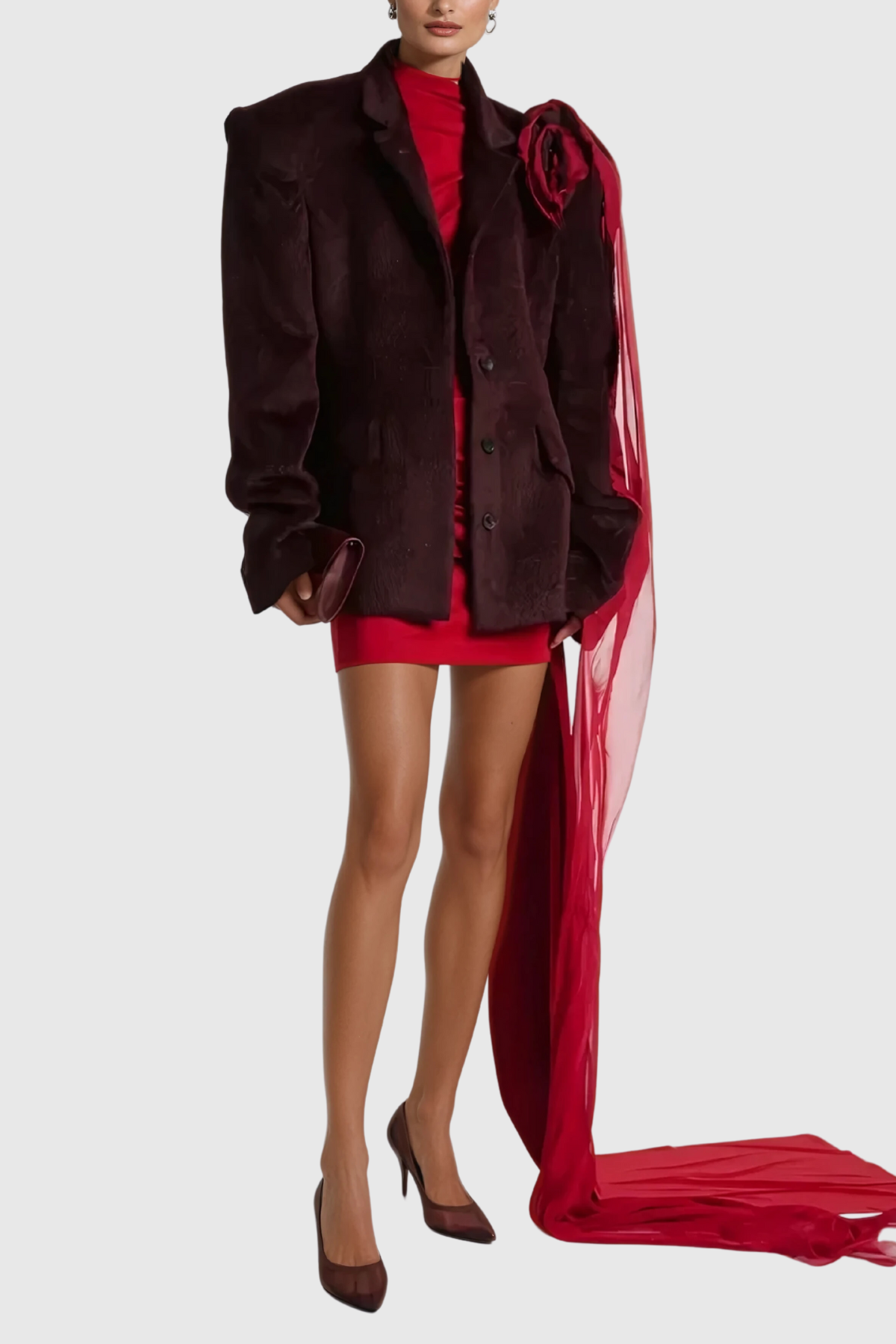 Unleash your inner style icon with the Akua Plunge Flower Fringe Blazer. This statement piece features a daring plunging neckline and delicate flower fringe accents. adding a touch of femininity to your wardrobe. Made with high-quality materials. this blazer exudes luxury and sophistication. Elevate any outfit with this must-have piece.