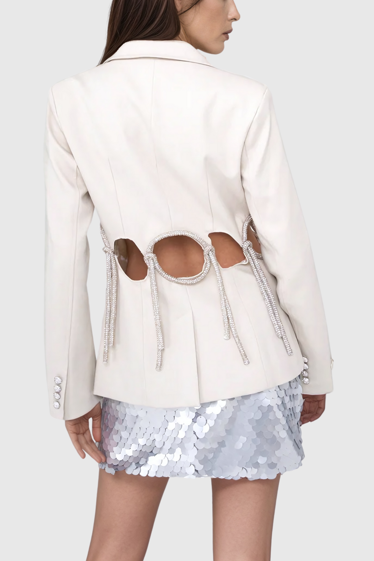 Achieve a sophisticated and elegant look with the Aldridge Cutout Rhinestone Rope Blazer in White. The blazer features stunning cutouts and intricate rhinestone rope detailing. adding a touch of glamour to any outfit. Made with high-quality materials. this blazer guarantees comfort and style. Elevate your wardrobe with this statement piece.