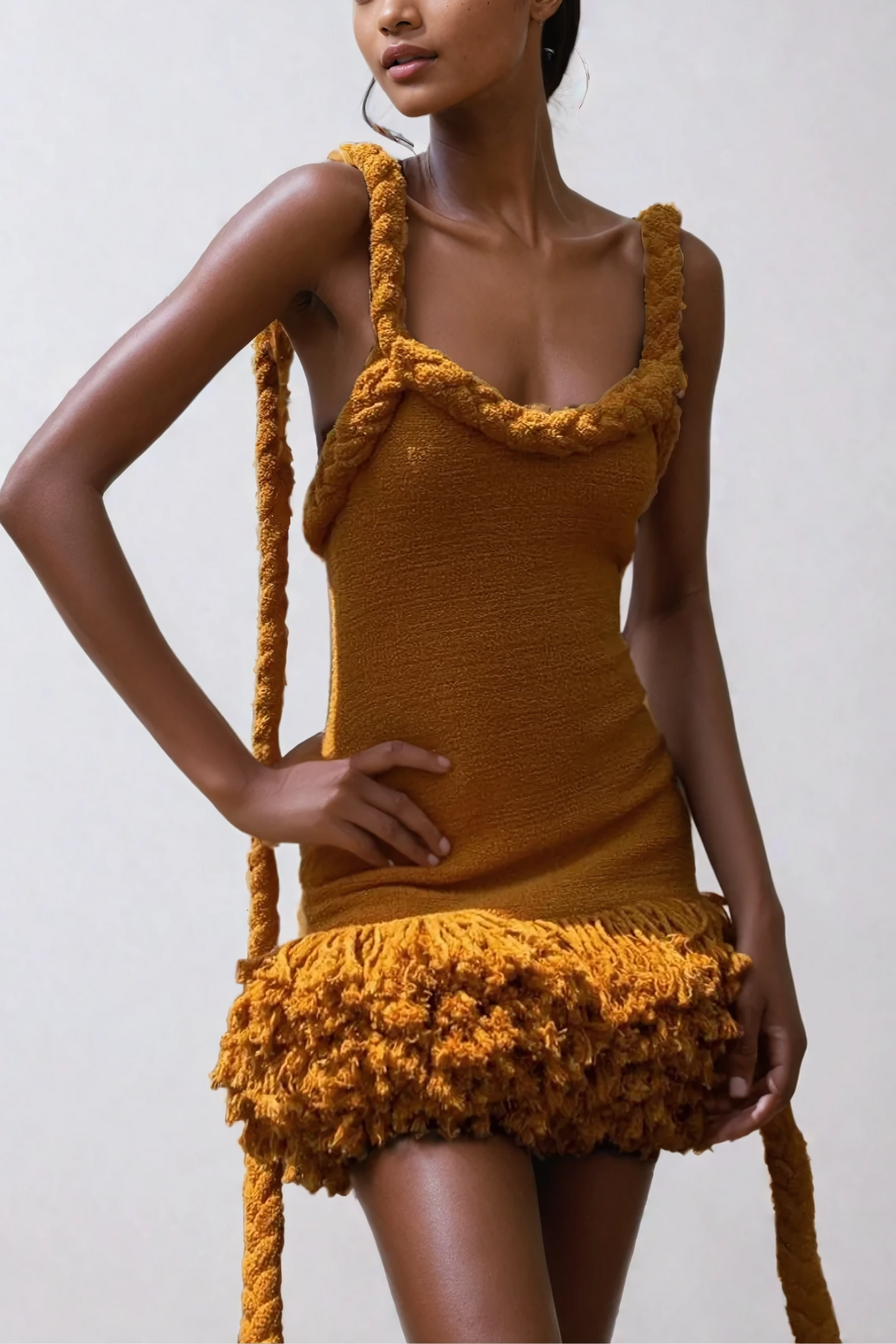The Alvis Bodycon Fringe Twist Knit Mini Dress in Yellow features a flattering bodycon fit with a twist knit design and fringe detailing. Made with high-quality materials and designed for both comfort and style. this dress is perfect for making a statement at any occasion. Get yours in sunny yellow today!