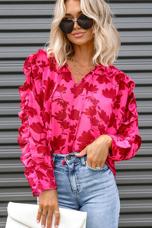 We just can't wait for you to check out this blouse! It's so feminine and cute! The ruffled detailing around the neckline and shoulders is perfection! You are going to love styling this blouse with chic trousers or jeans! This blouse features long sleeves with an elastic cuff. a high neckline. floral print and ruffled detailing.
