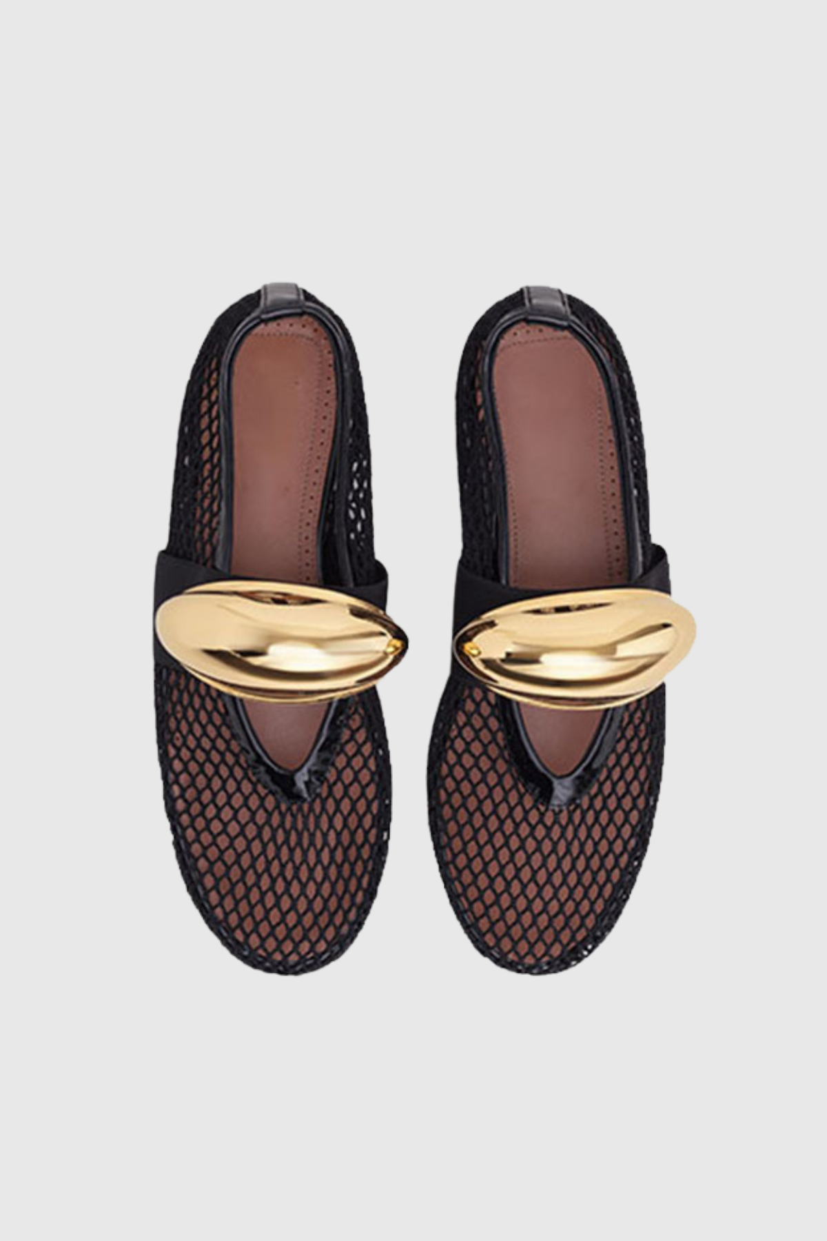 Experience comfort and style with Aria Hollow Buckle Fishnet Flats. Crafted with a unique hollow buckle design and fishnet fabric. these flats add a touch of sophistication to any outfit. Enjoy the perfect fit and effortless elegance with Aria.