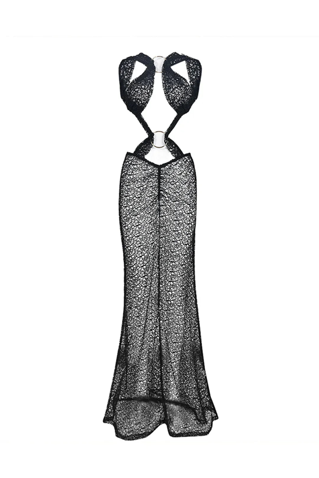 This bold dress features a net-weaving design with metal circle accents. creating a daring look that will turn heads.