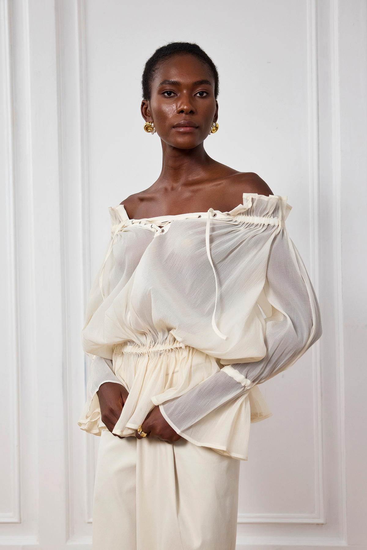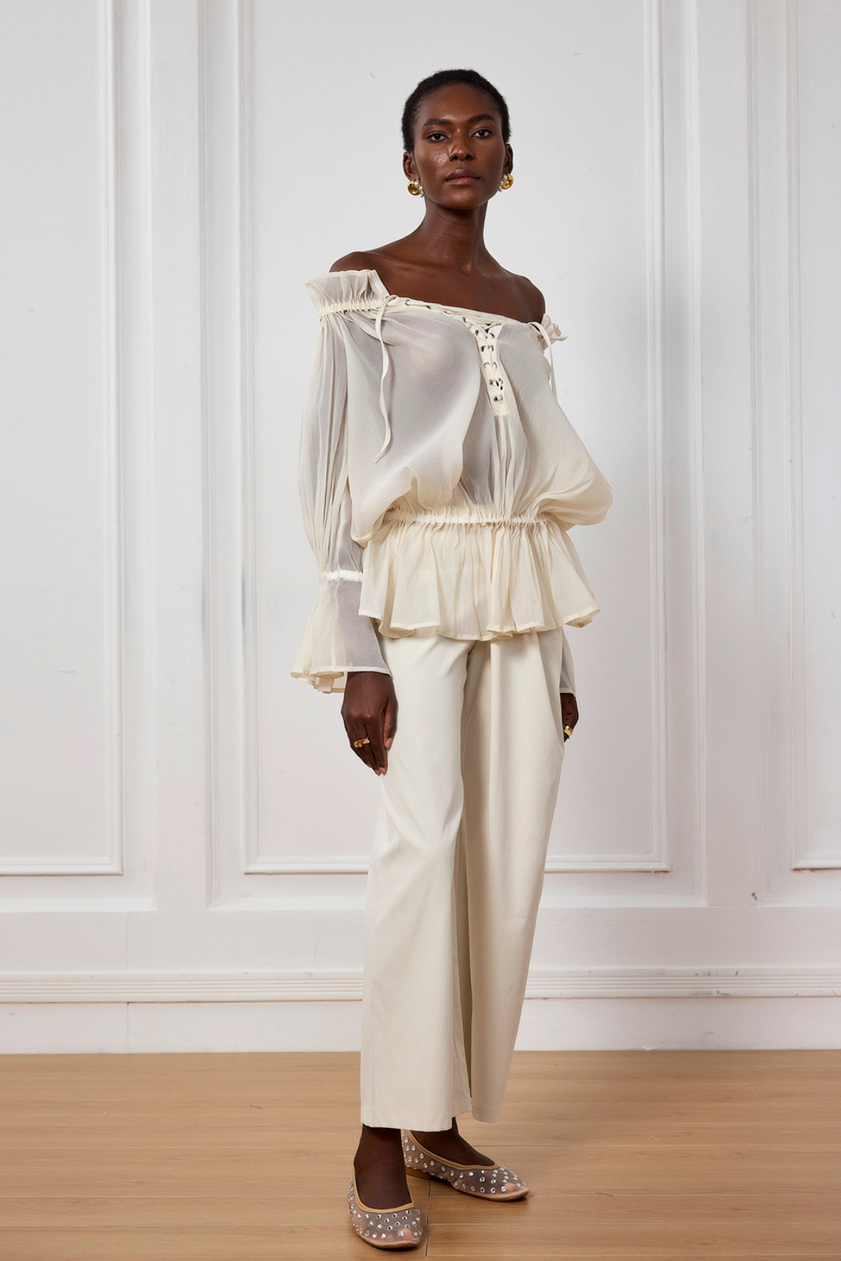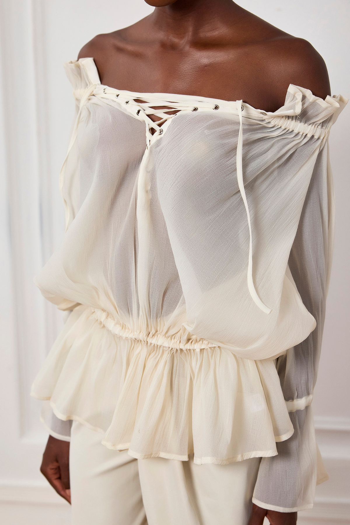 Introducing the Blessing Lace Up Mesh Ruffle Top. With its delicate lace up design and airy mesh fabric. this top is perfect for any occasion. Featuring ruffle accents and a flattering fit. it's a must-have for your wardrobe. Elevate any outfit with this stylish and versatile top.
