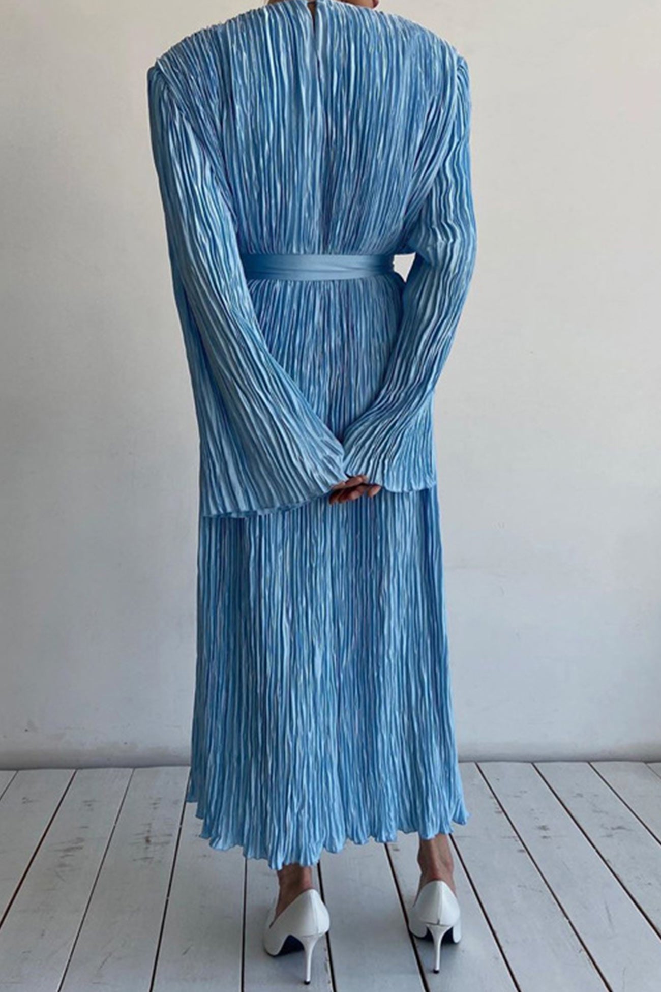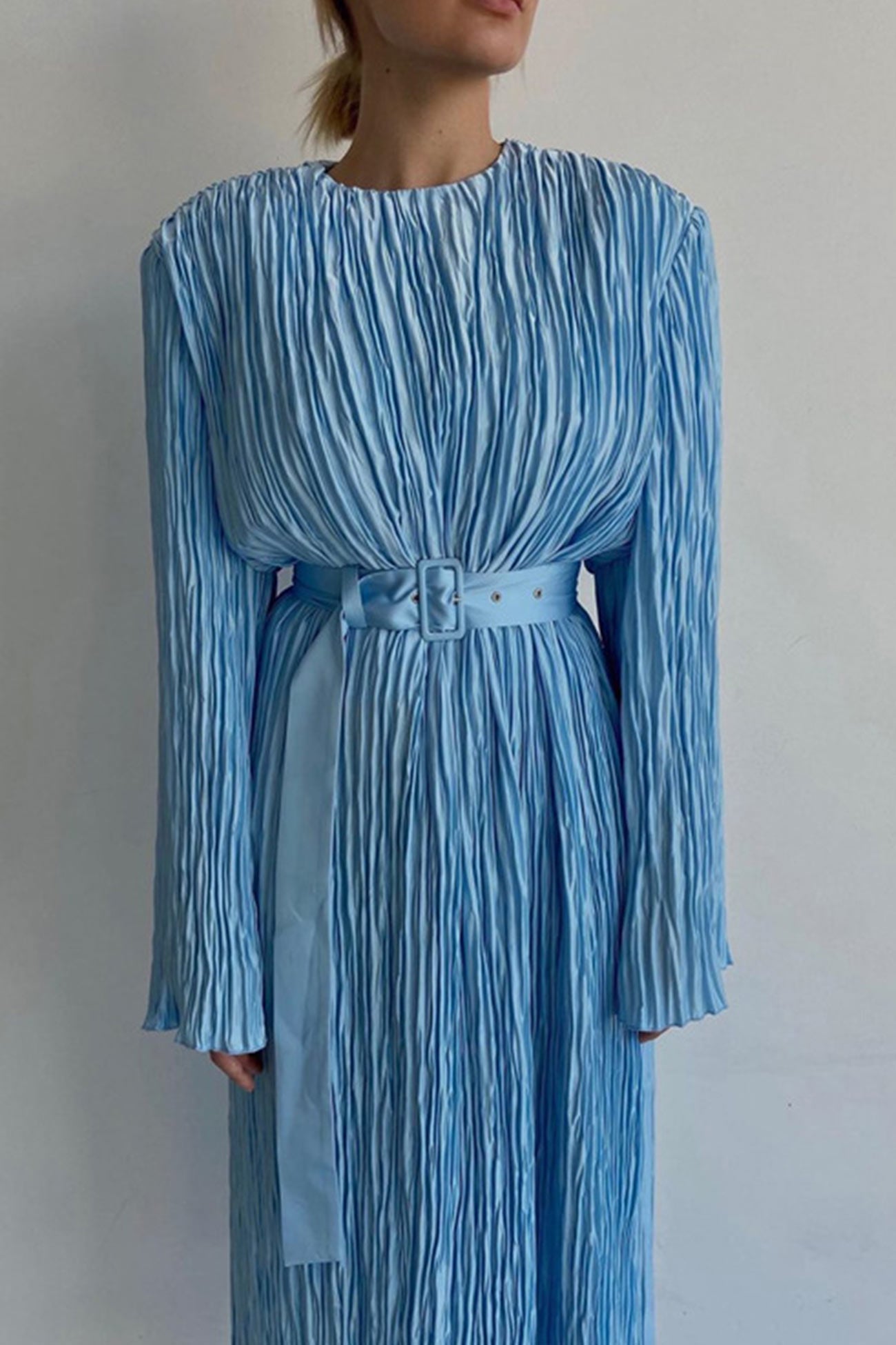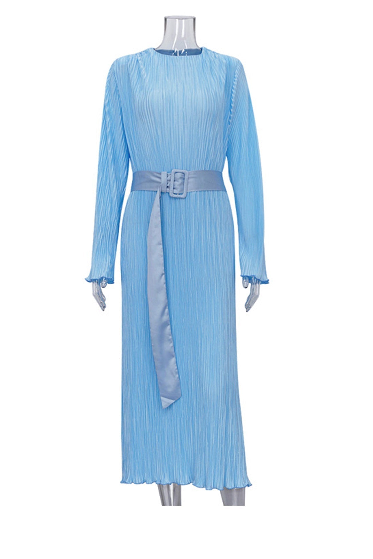 Blue Belt Waisted Pleated Midi Dress