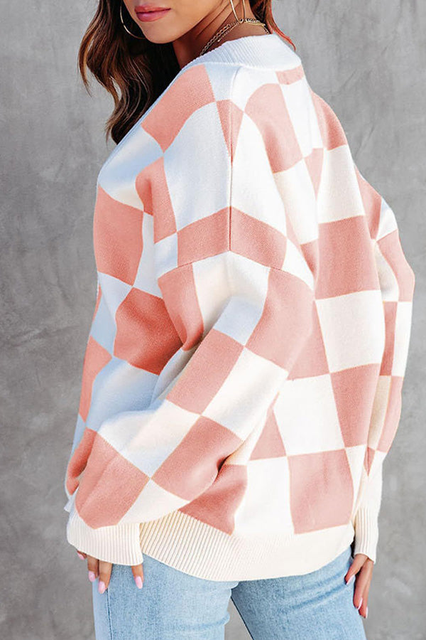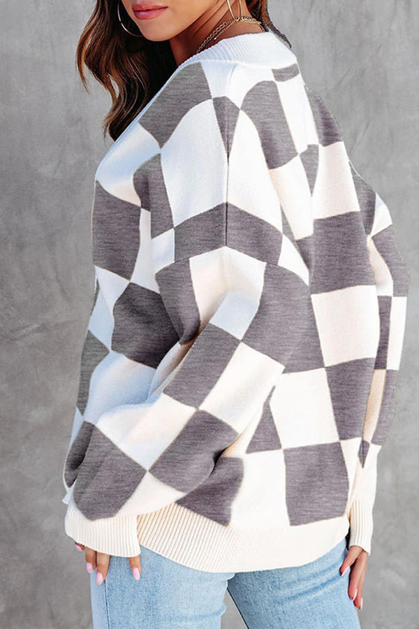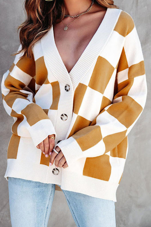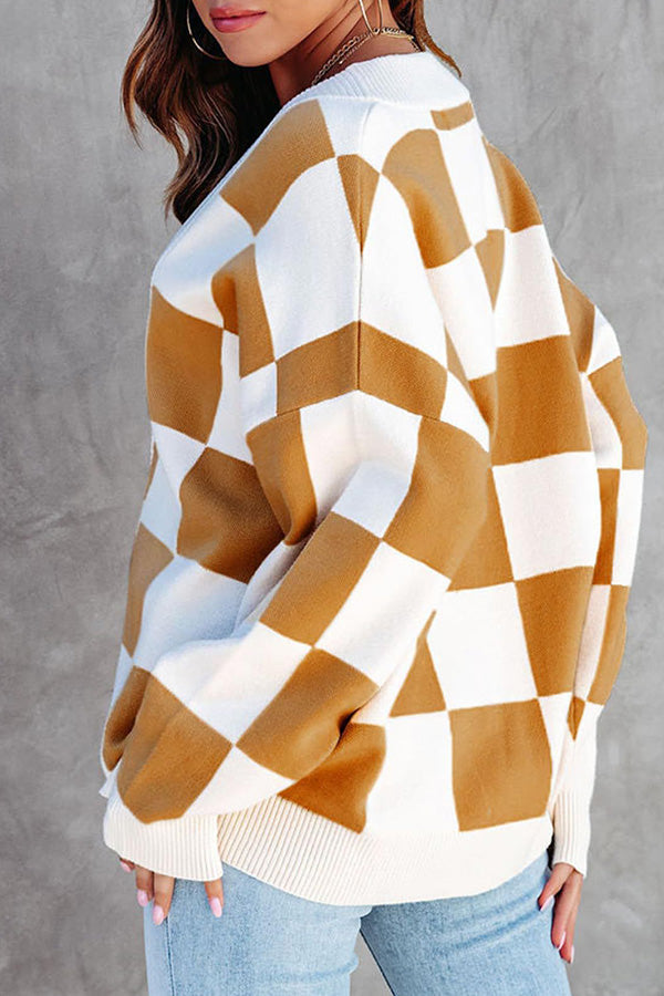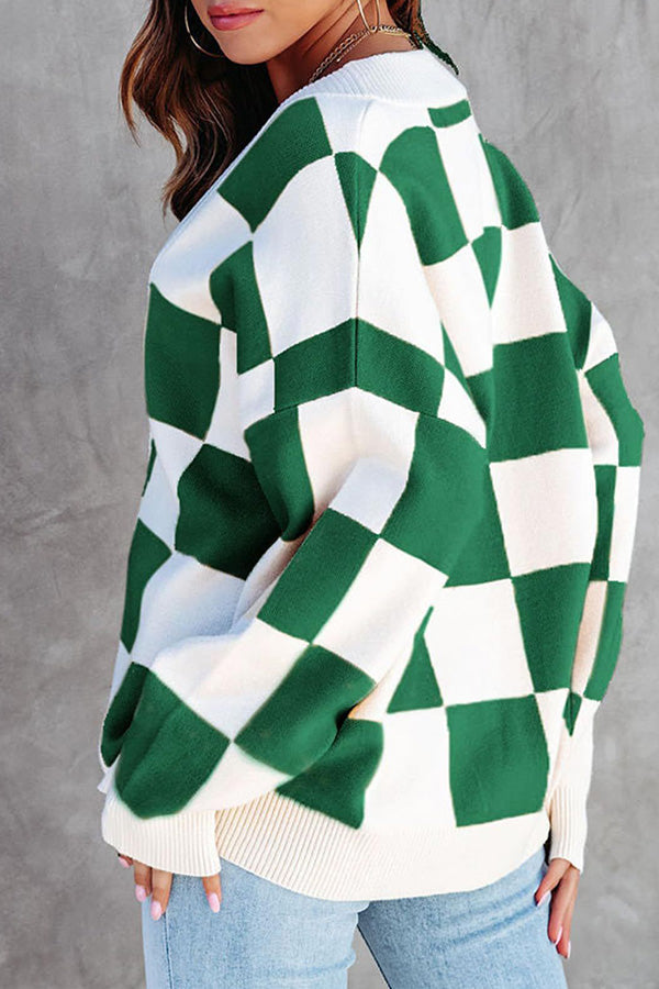 Casual loose checkerboard contrasting V-neck buttoned long-sleeved knitted cardigan
