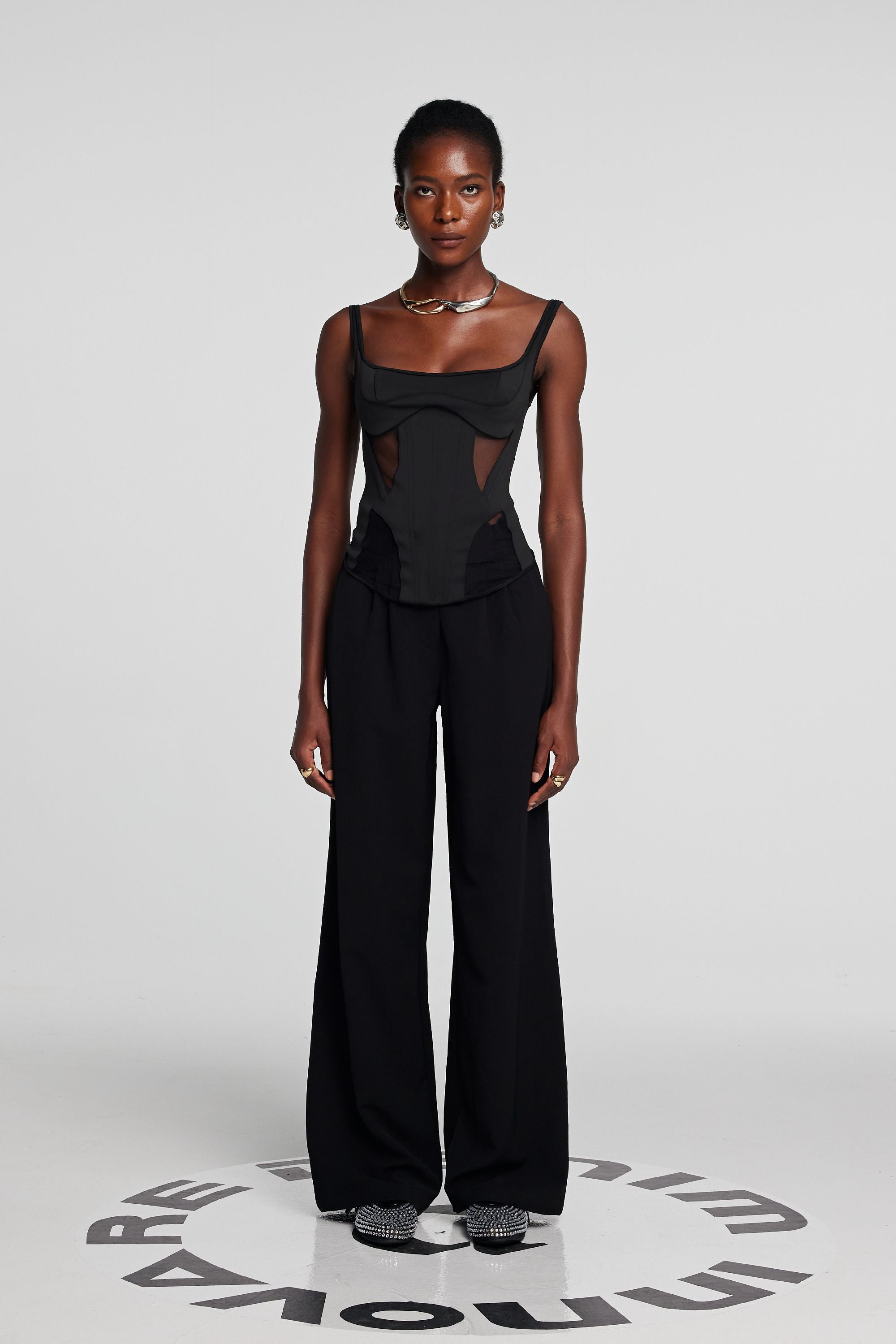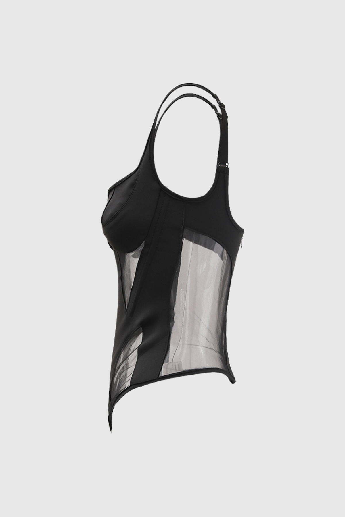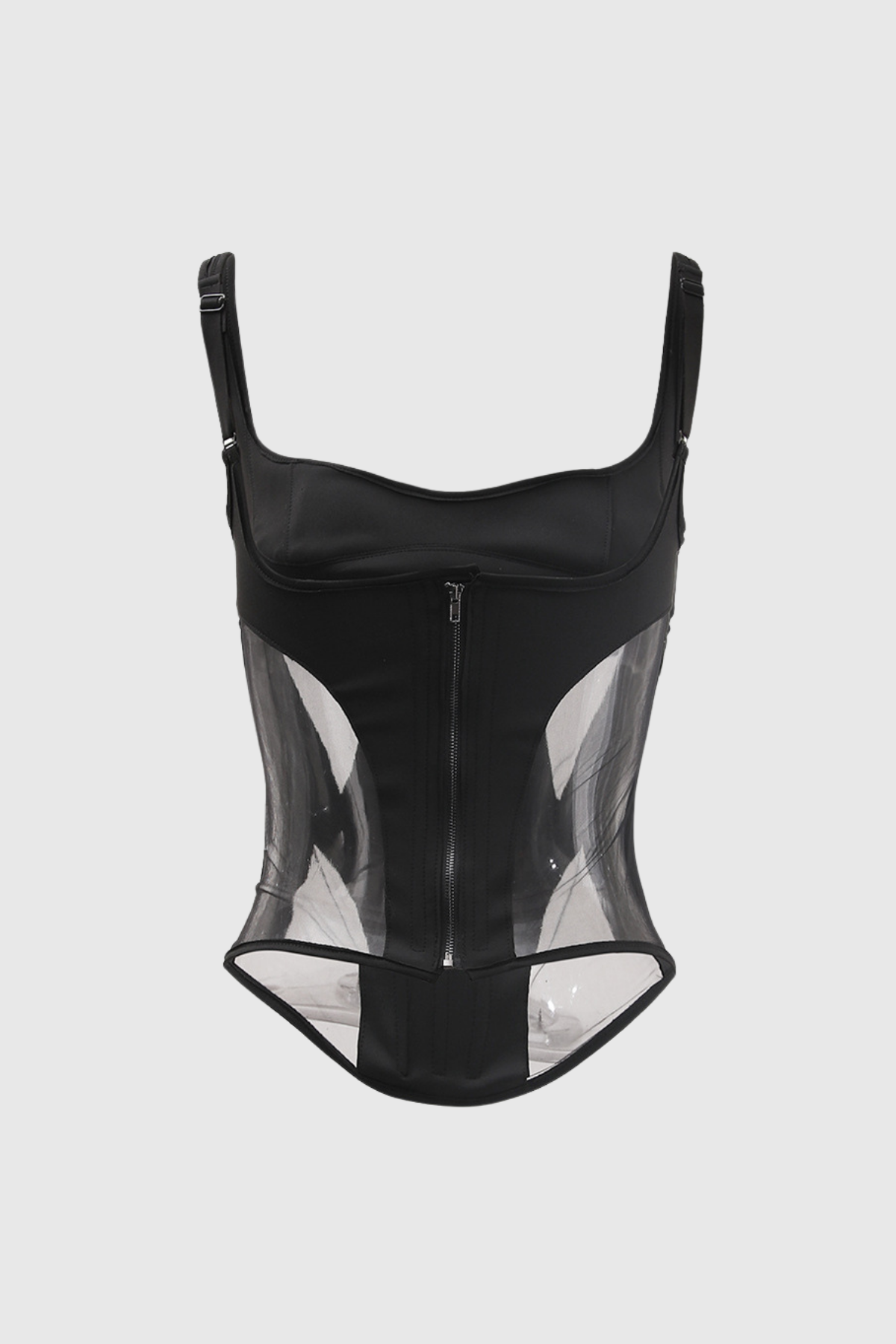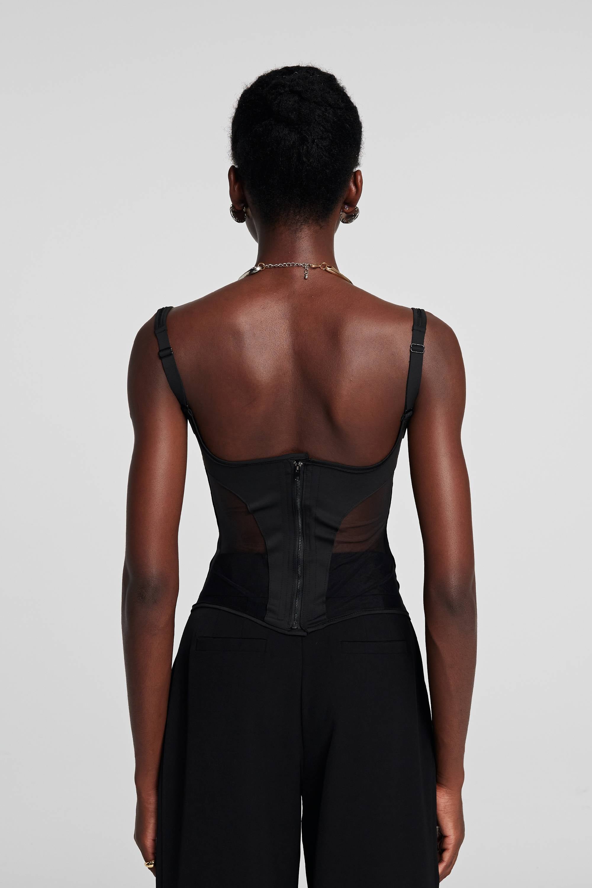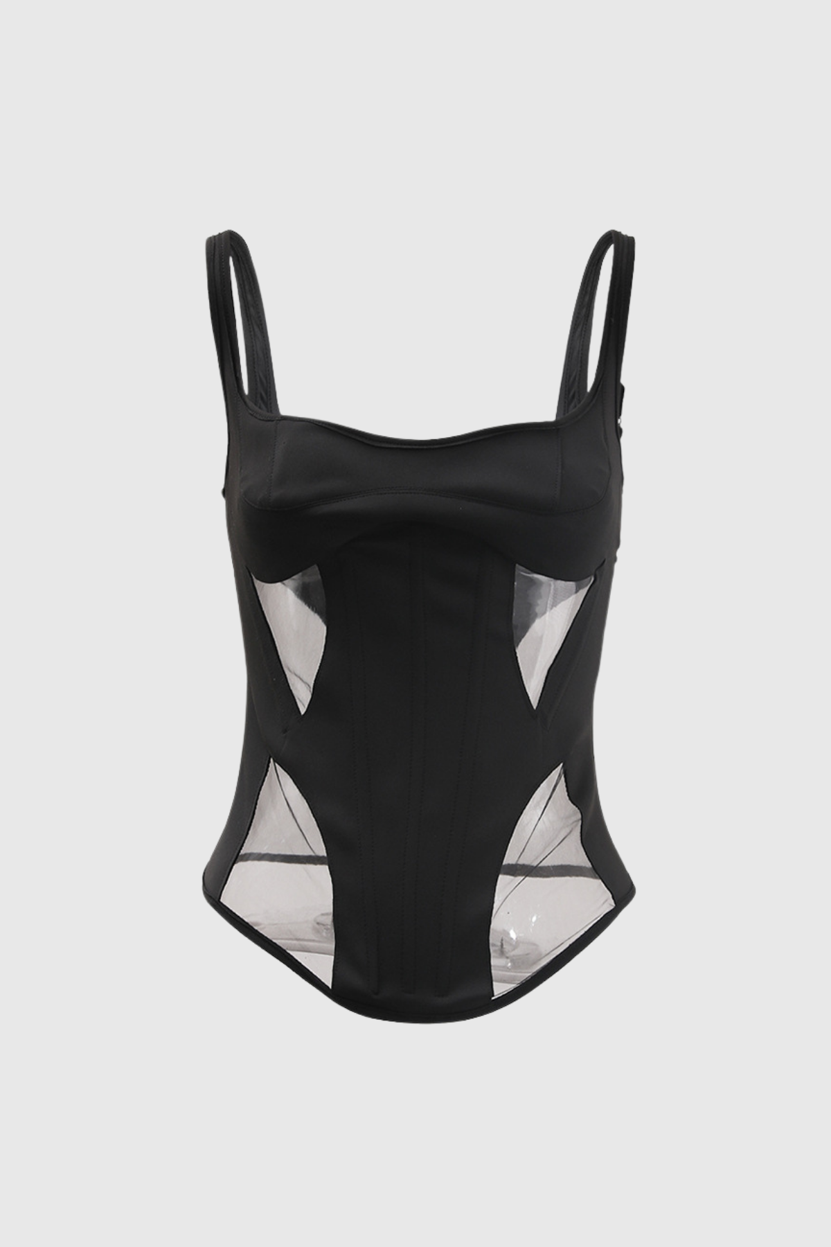 This Chana Corset Mesh See Through Top in Black is the perfect addition to your wardrobe. Made with high-quality mesh material. it offers a unique see-through design that adds a touch of sexiness to any outfit. The corset style provides a flattering fit. while the black color adds a classic touch. Perfect for a night out or a special occasion. this top is versatile and stylish.