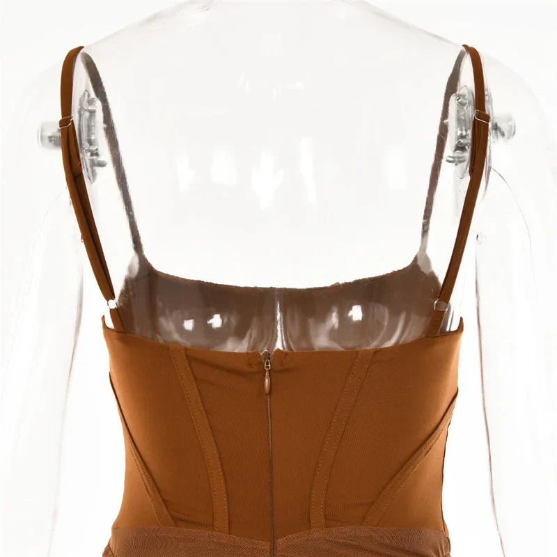 A captivating garment that combines vintage allure with contemporary fashion. It features a beautifully designed corset top that cinches the waist. The ruched detailing throughout the dress adds texture and sophistication. enhancing the body's natural curves.