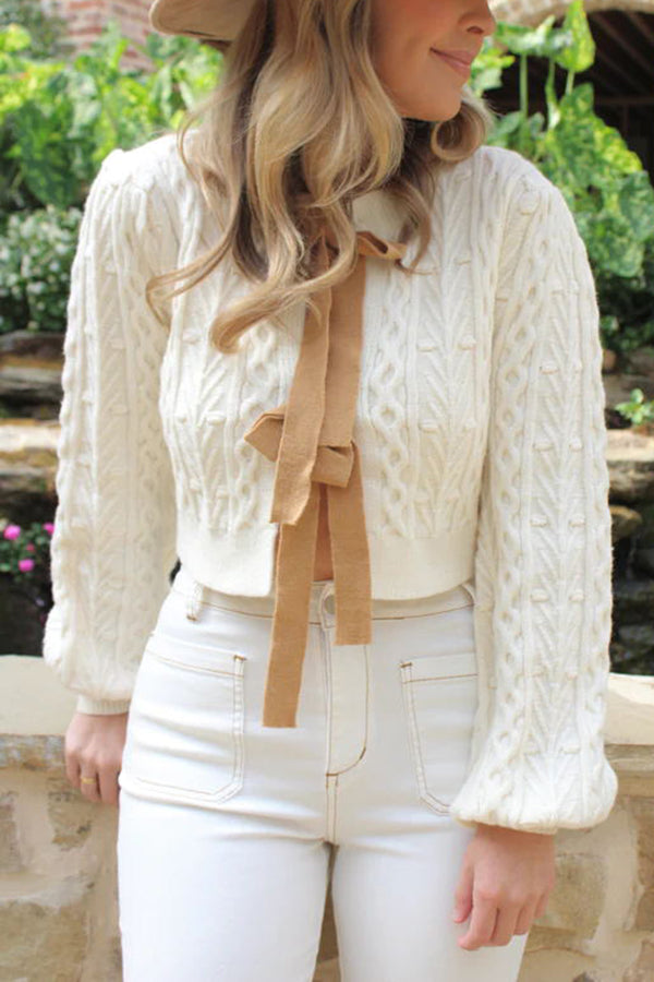 Stay cosy and stylish with this cable-knit Bow Detail Sweater. Soft and breathable. this sweater features ivory double front ties and an open front with a slightly cropped design. Look effortlessly chic with this must-have piece.
