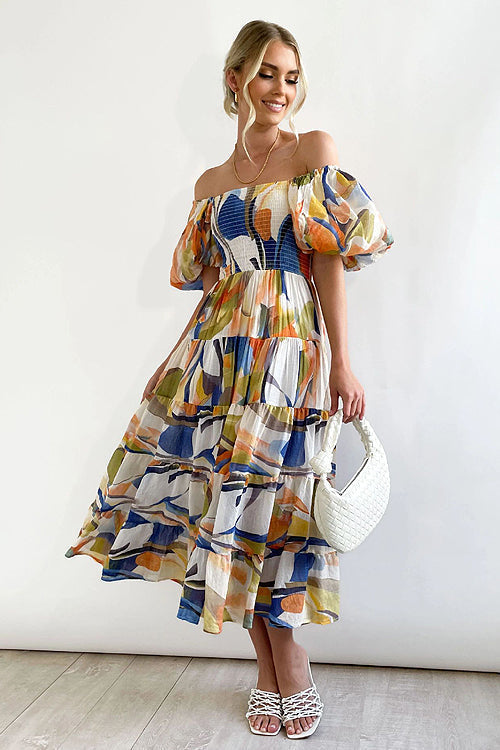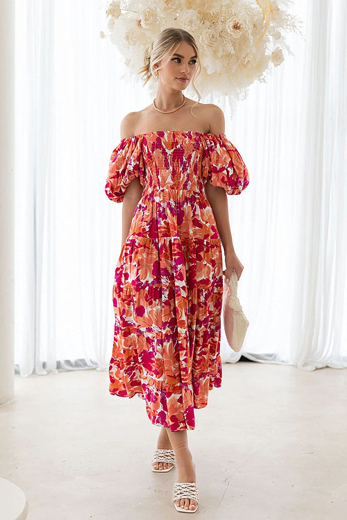 You'll have nothing but love for the Darling Daylily Floral Print Off Shoulder Smocked Maxi Dress! Textured woven chiffon. with a colorful floral print throughout. shapes this dress that has off the shoulder neckline. short puff sleeves. and a princess-seamed bodice with smocking. The full maxi skirt is accented with tiers.