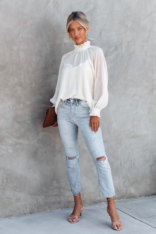 You are going to be dreaming of the days you get to wear this blouse! It's so chic and classy! The sheer bubble sleeves are ultra light and feminine and we love the slight shimmer from the thin metallic threading! This blouse is going to easily style for work or for a nice dinner! This blouse features long sleeves with elastic wrists. a high ruffled neckline. and a button/keyhole back.