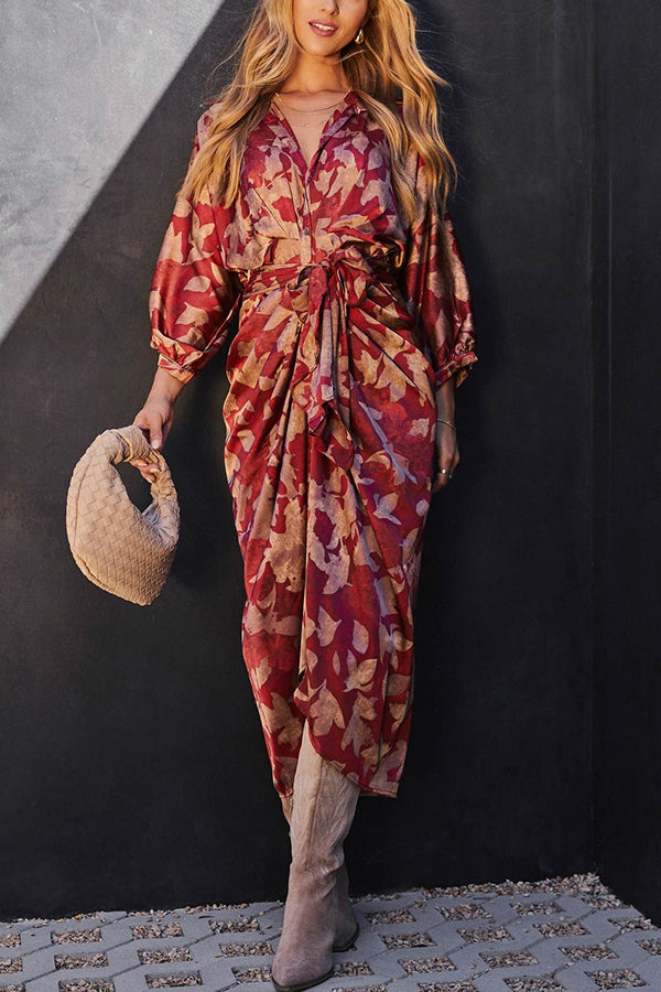 Elegant and autumn-ready in a brick red color and smooth. satin fabric. this midi-dress features a collared neckline and draped fit. An adjustable waist tie and front button closures are versatile finishing touches. Wear it to happy hour with strappy heels and a clutch.