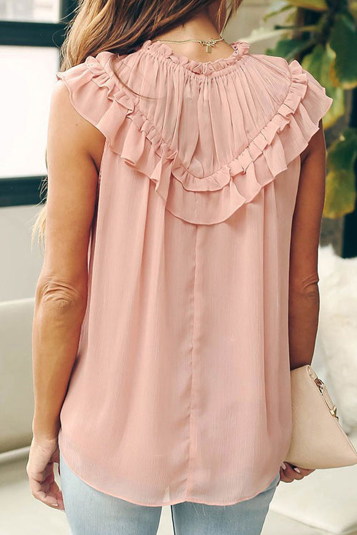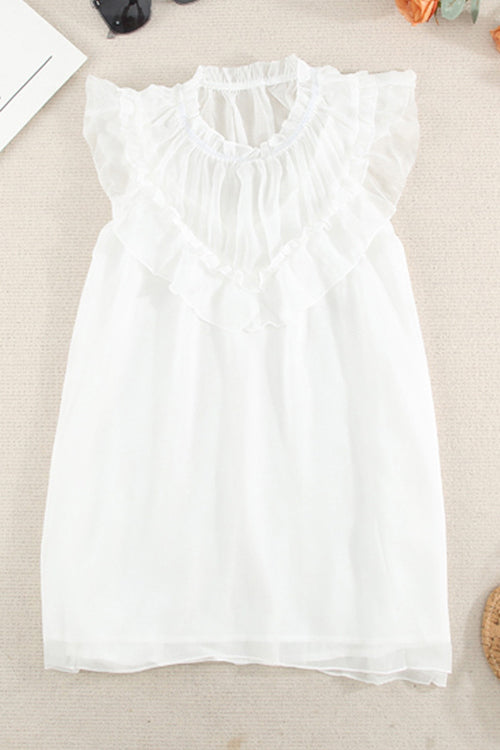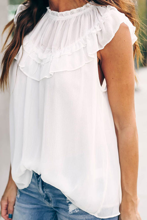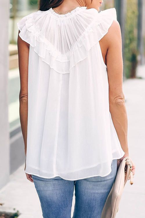We bet that you are going to look like a sweetie in this tank! If you don't believe us. then you should put it to the test! This tank has feminine ruffles along the shoulders which give a gorgeous dramatic flair! This tank features a high round neckline. ruffled detailing. and a button keyhole back.