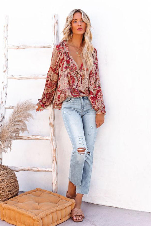 The love you are going to have for this blouse is astounding! That floral print is so romantic and we love the colors! But it's that structured sweetheart neckline and the bubble sleeves that truly won us over! This blouse features long bubble sleeves. a floral print. and a rigid sweetheart neckline.