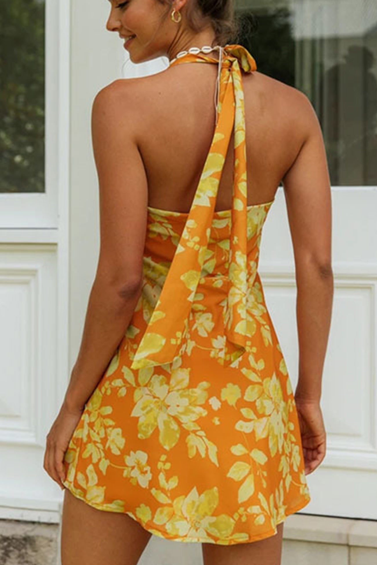 Insrs - Floral Print Tie-Back Yellow Dress