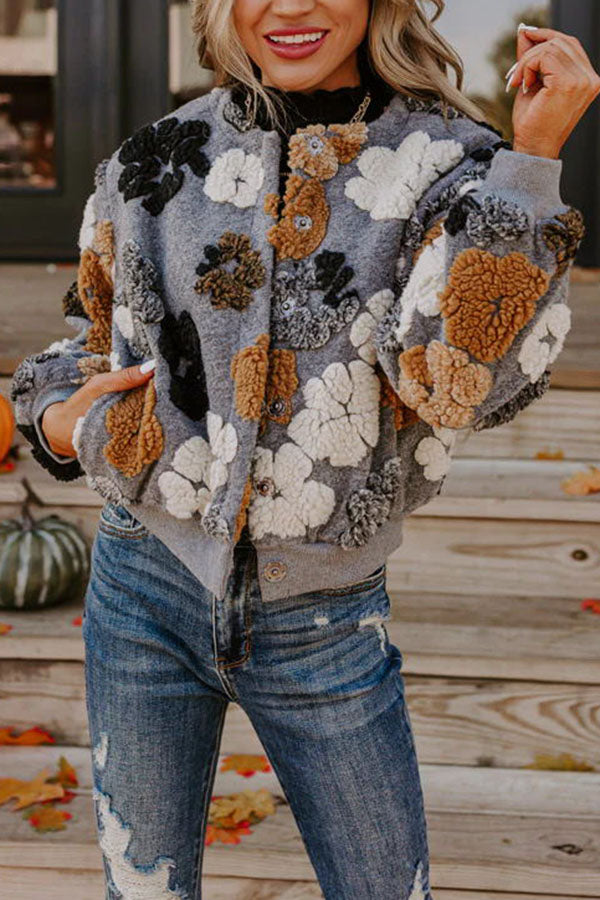When the leaves are falling this cozy jackets is calling! - Warm unlined material with a black. ivory. and brown hued sherpa flower pattern - A round neckline - A button closure front - Long. loose sleeves with ribbed cuffs - Functional side pockets - A relaxed silhouette that ends in a fitted ribbed waist band.
