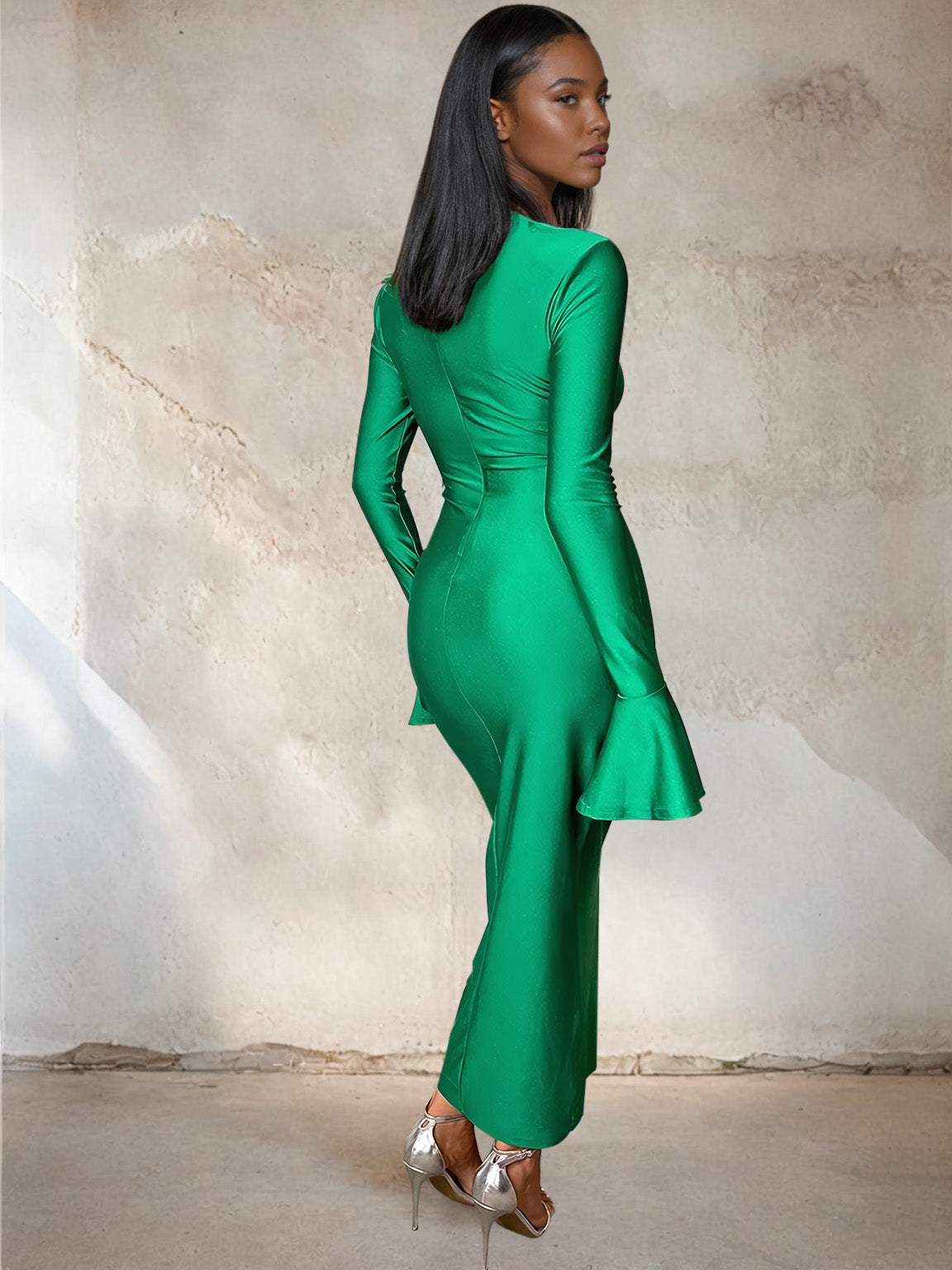 The dress's most striking feature is the front cut-out which offers a modern twist on the classic maxi silhouette. The long flare sleeves add a dramatic flair and movement. Made from a flowing fabric. the dress ensures a smooth and flattering fit. while the maxi length lends itself to a variety of occasions.