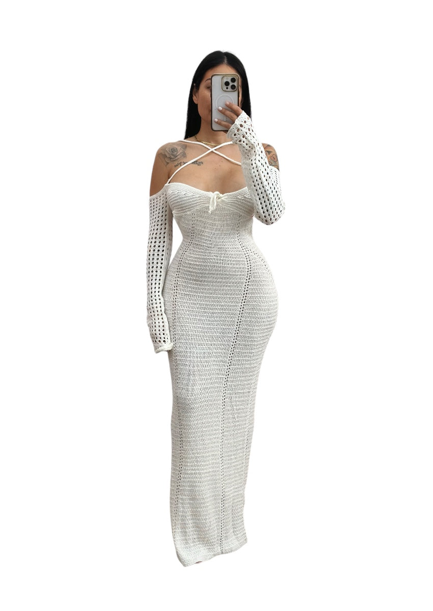 This will be your new favorite. This elegant White Halter Knitting Dress is perfect for any holiday occasion. Its backless design and lace-up details add a touch of sexiness. while the knitting fabric ensures comfort and style. Maximize your fashion statement with this long autumn dress that exudes elegance.