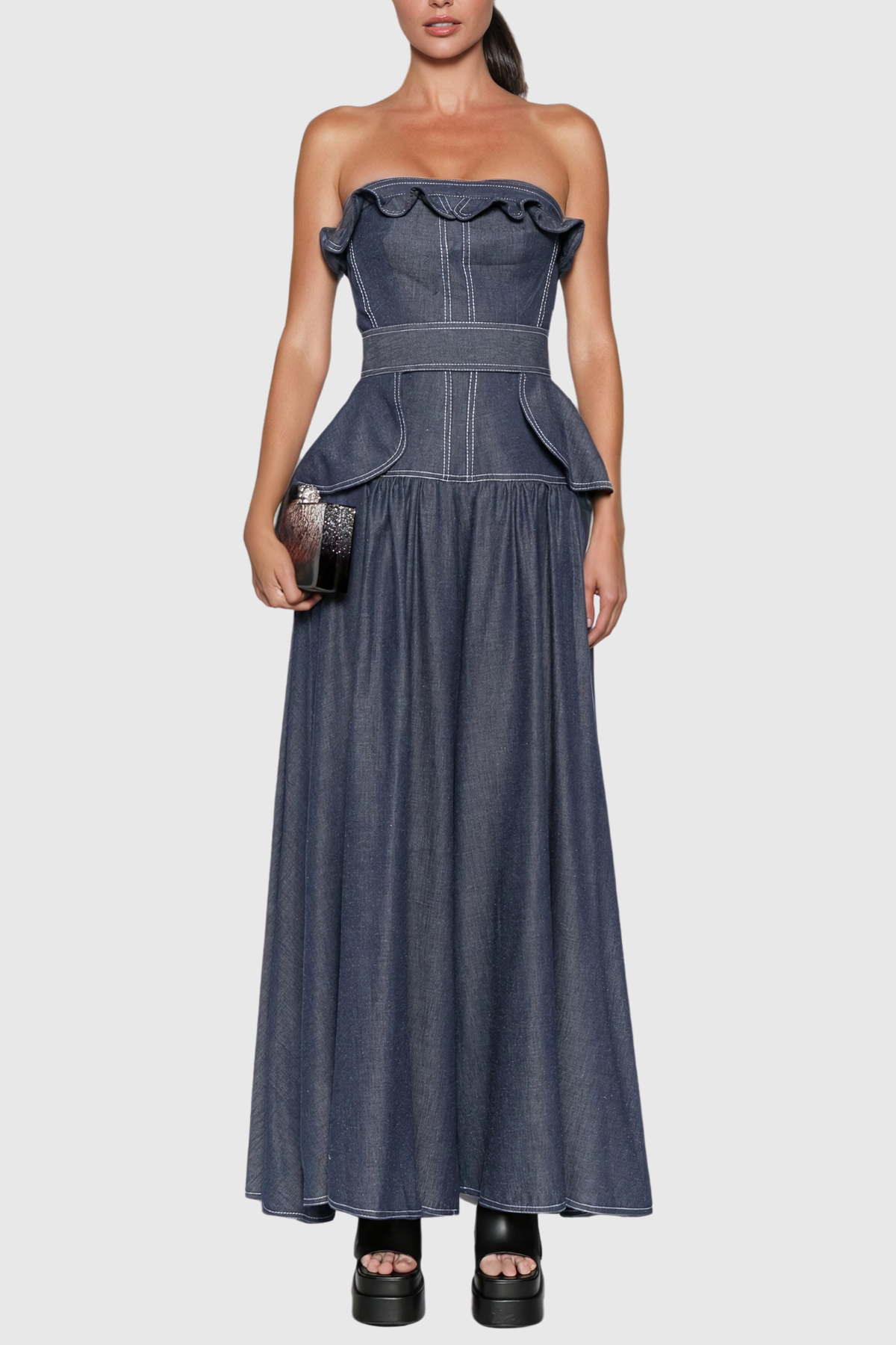 Experience comfort and style with the Kashvi Ruffle Strapless Denim Maxi Dress. Made with soft denim fabric. its ruffle detailing adds a feminine touch to your look. The strapless design allows for versatility and can be dressed up or down for any occasion. Upgrade your wardrobe with this must-have dress.