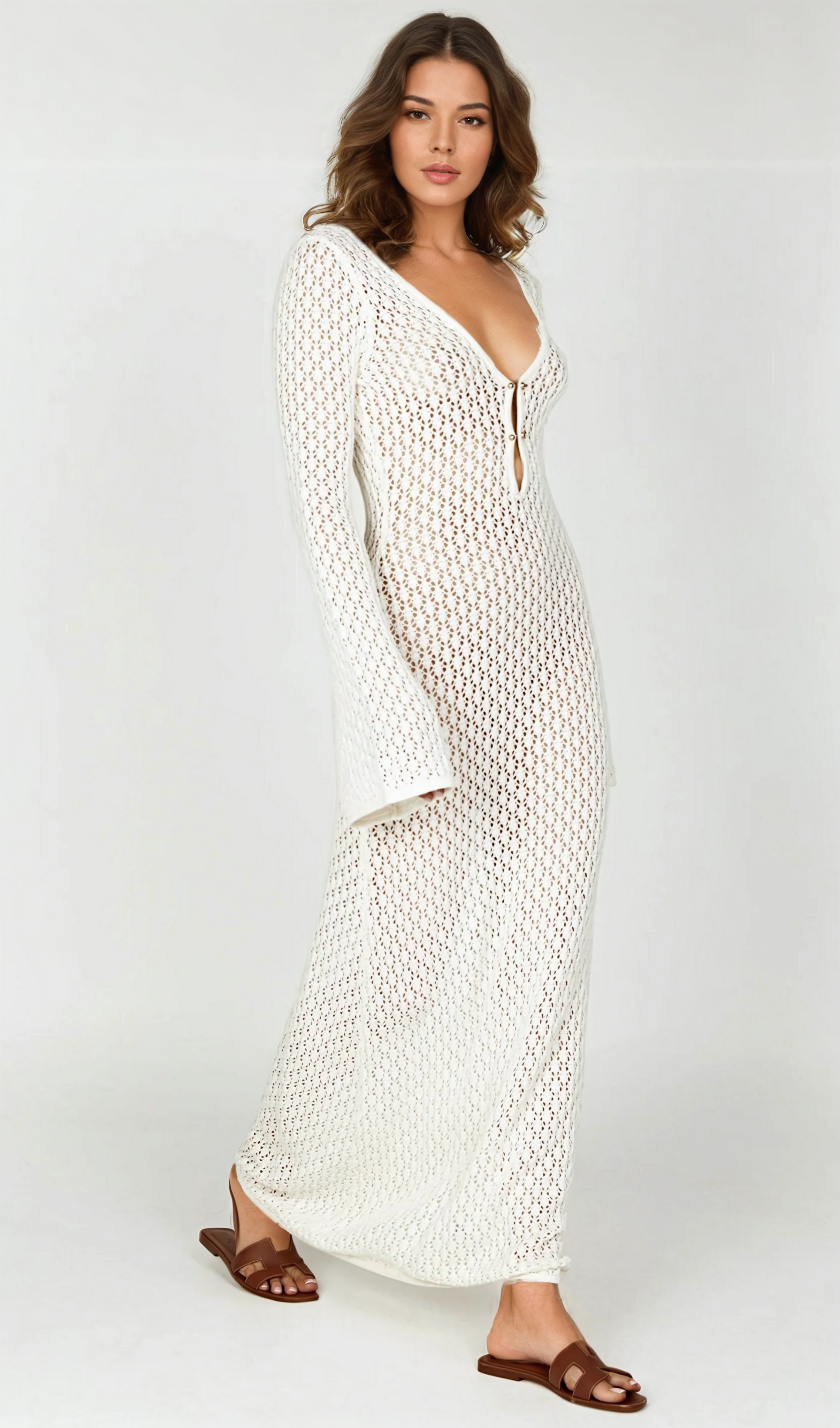 Expertly crafted with a soft. breathable knit fabric. the Lana Knit Hollow Plunge Maxi Dress is designed to provide ultimate comfort and style. Featuring a flattering plunge neckline and intricate hollow detailing. this dress is the perfect addition to your wardrobe for any occasion.