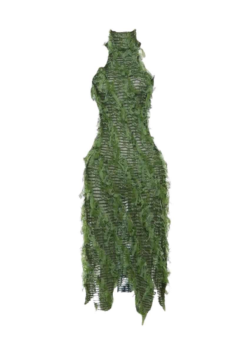 This dress features a refreshing green 3D leaf pattern. a flattering halter neck. and a flowing skirt. perfect for a garden party or a breezy evening.