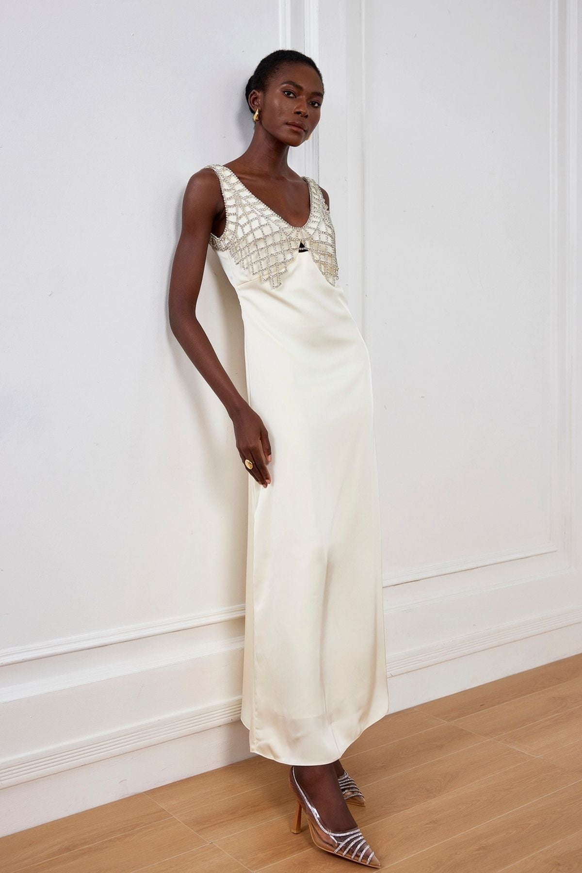 Expertly crafted with a V neckline and adorned with sparkling crystals. the Ledini Maxi Dress in White is a stunning addition to any wardrobe. Made with high quality materials. this dress offers a comfortable fit and effortless elegance for any special occasion.