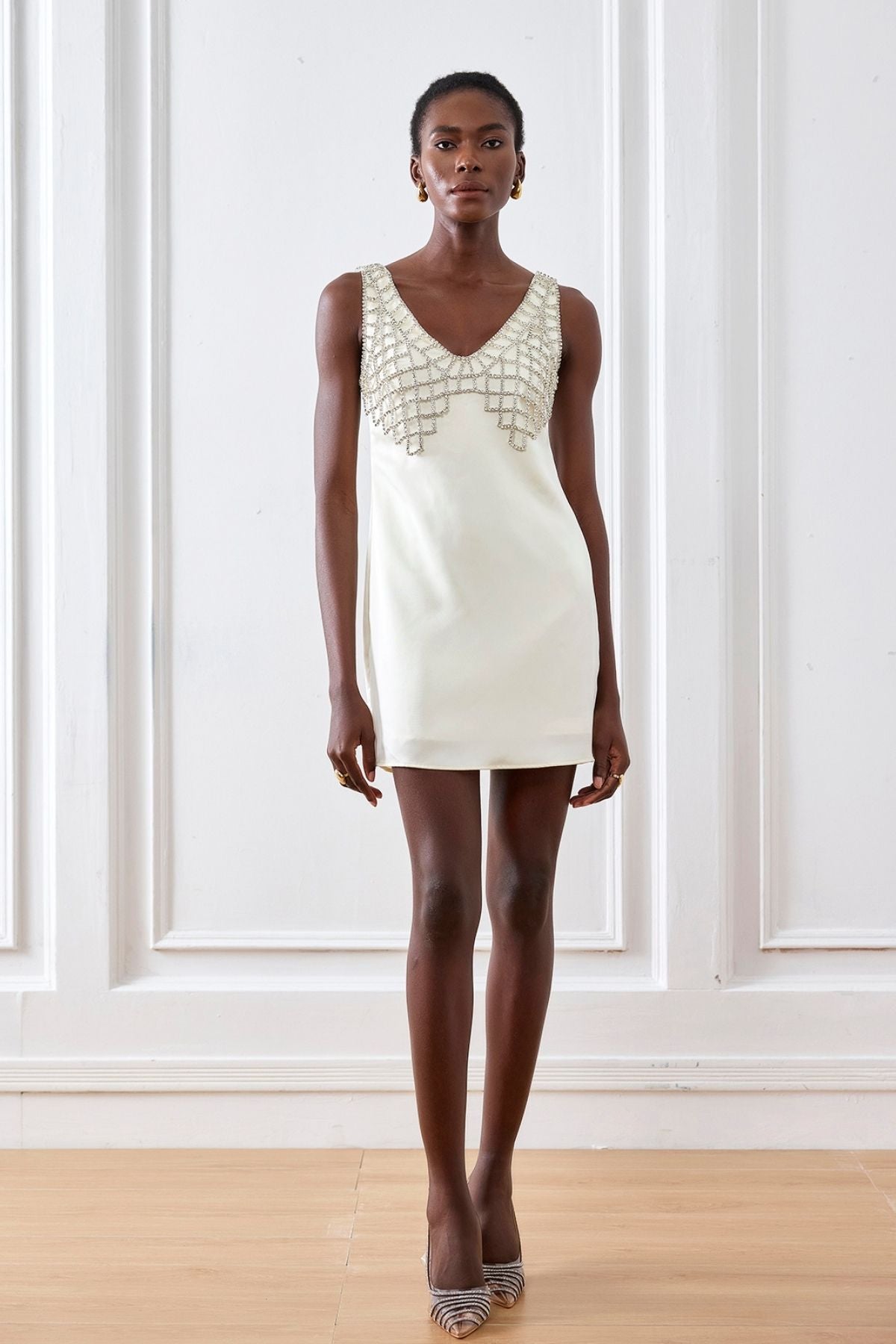 Expertly crafted and designed. the Ledini V Neck Crystal Mini Dress in White is the epitome of elegance and sophistication. Featuring a flattering V-neckline and intricate crystal detailing. this dress will make you stand out in any crowd. Perfect for special occasions. the dress is sure to make you feel confident and stylish.