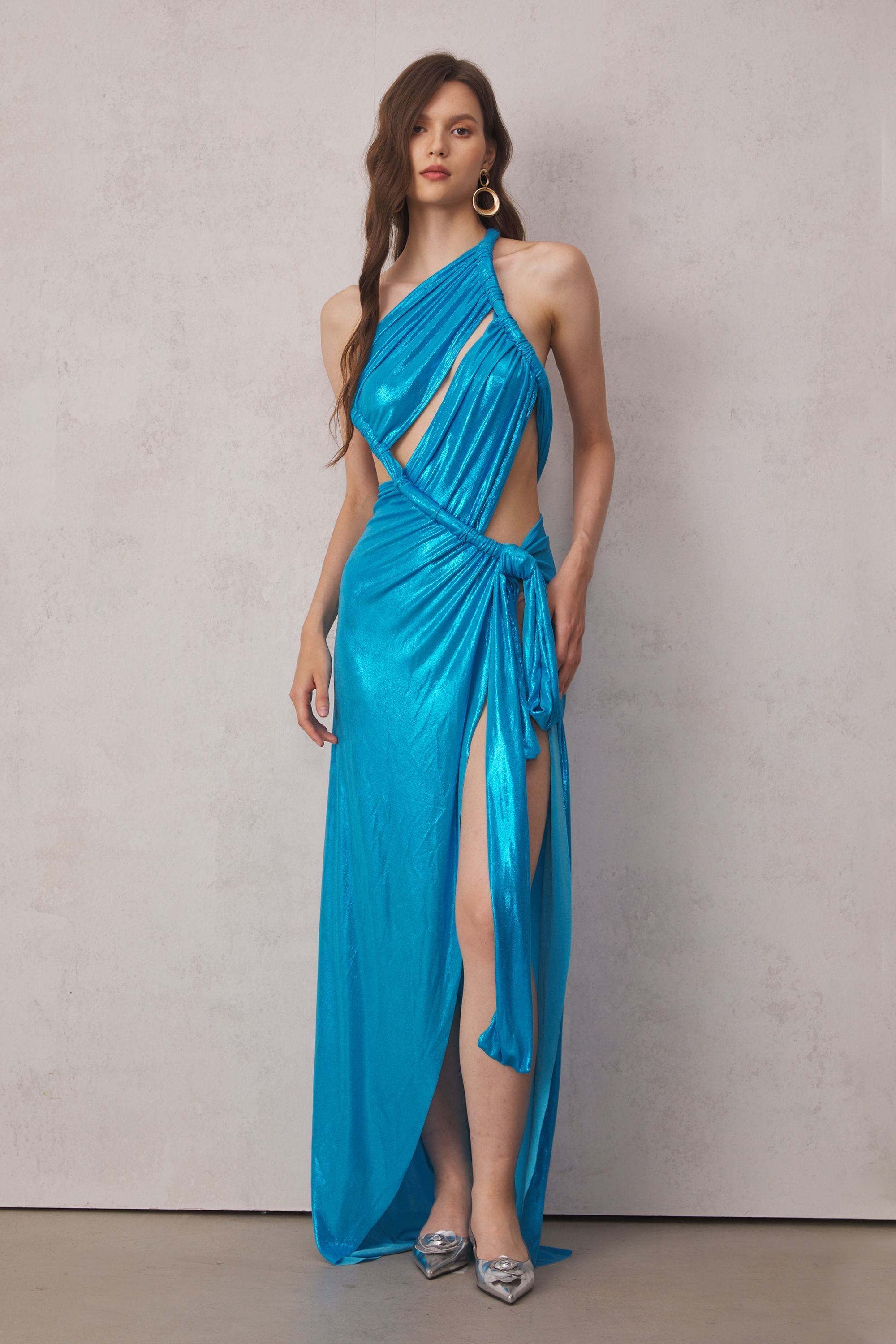 Introducing the Elise Metallic Split Maxi Dress In Blue. a stunning addition to any wardrobe. Made with a shimmering blue fabric. this dress is perfect for special occasions or a night out. The split hem adds a touch of elegance while the metallic sheen gives a modern twist.