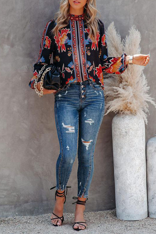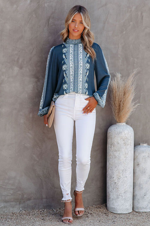 The Love Always Print Smocked Long Sleeve Top can easily go from the office to after-hours! Crinkle woven fabric. with a boho print. shapes this top that has a round neckline and balloon pleated long sleeves with elastic ruffle cuffs. The relaxed bodice has a round hem.