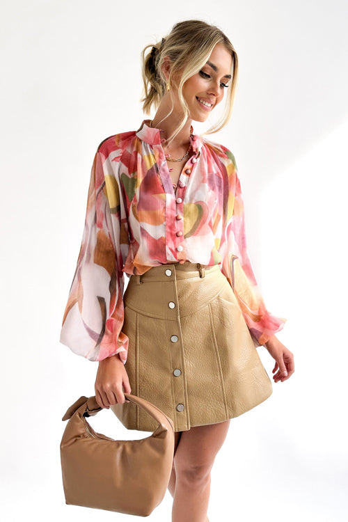 We certainly hope you find this blouse before it's gone! That print and those colors are perfection together! The fit is wonderful as well! The button down fit and bubble sleeves are so chic!