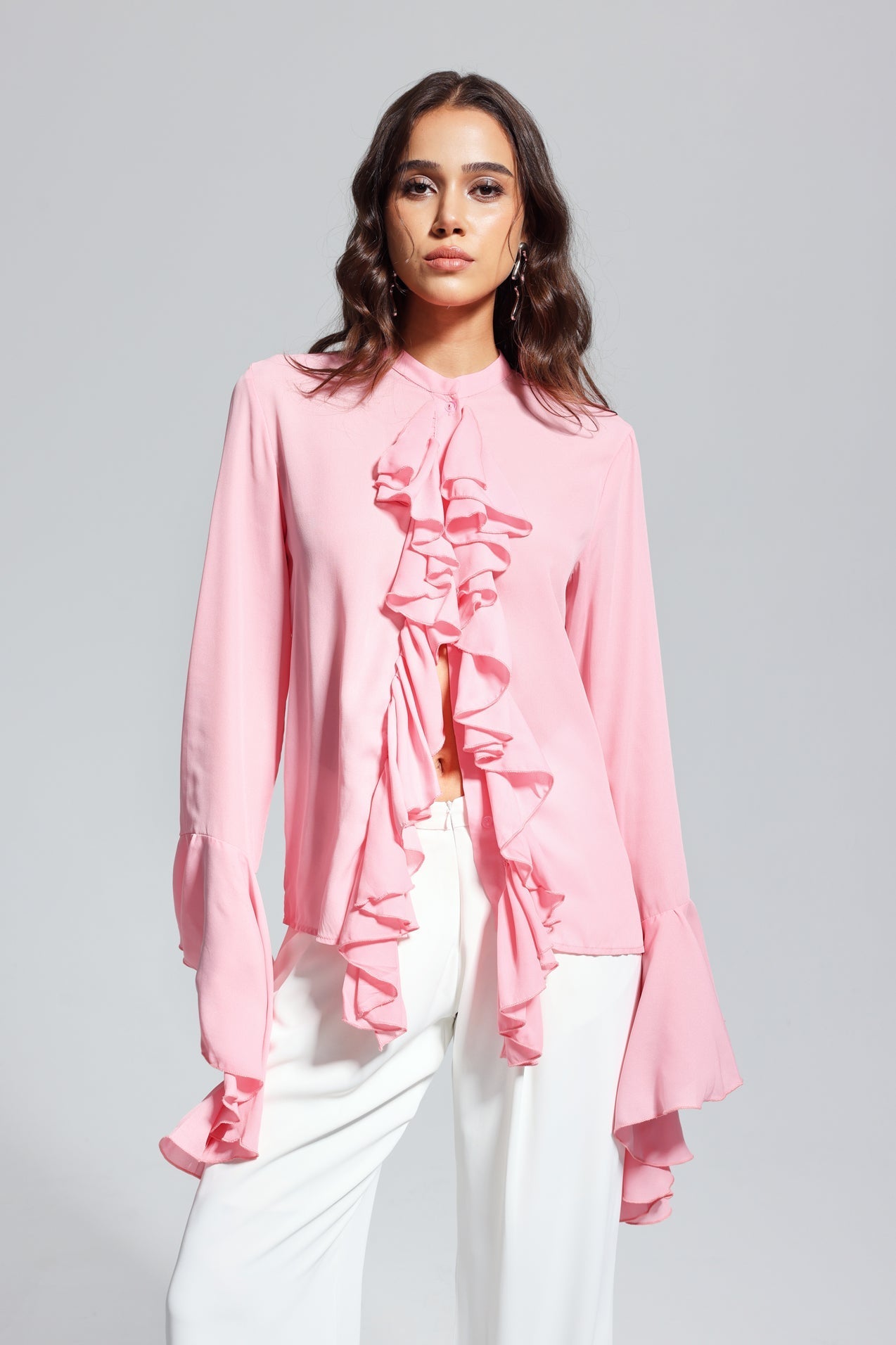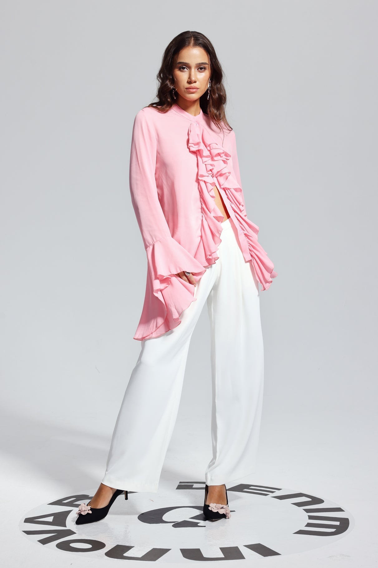 Upgrade your wardrobe with the Mandy Ruffle Split Asymmetric Top. This top features a unique split and asymmetric design. bringing a touch of elegance to your outfit. Made with quality materials. this top is both fashionable and comfortable. perfect for any occasion. Stand out from the crowd and elevate your style with this must-have piece.