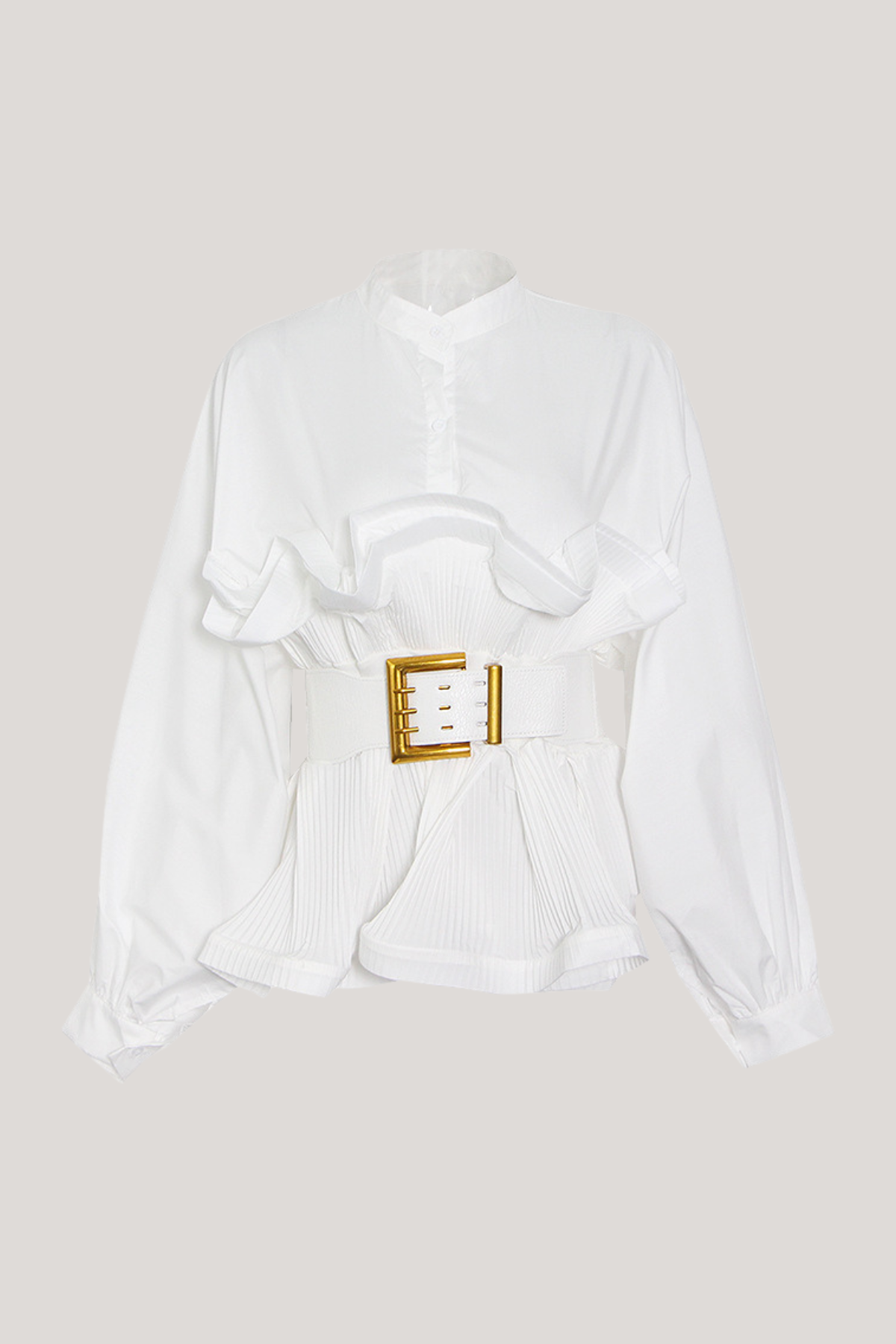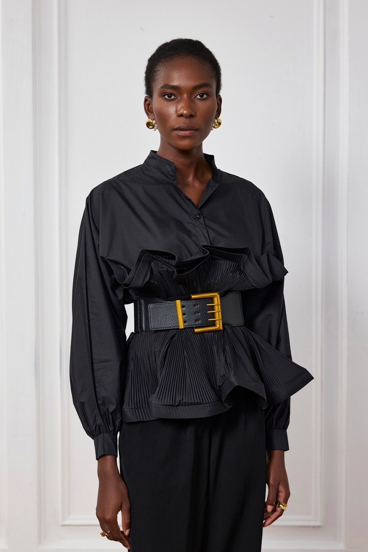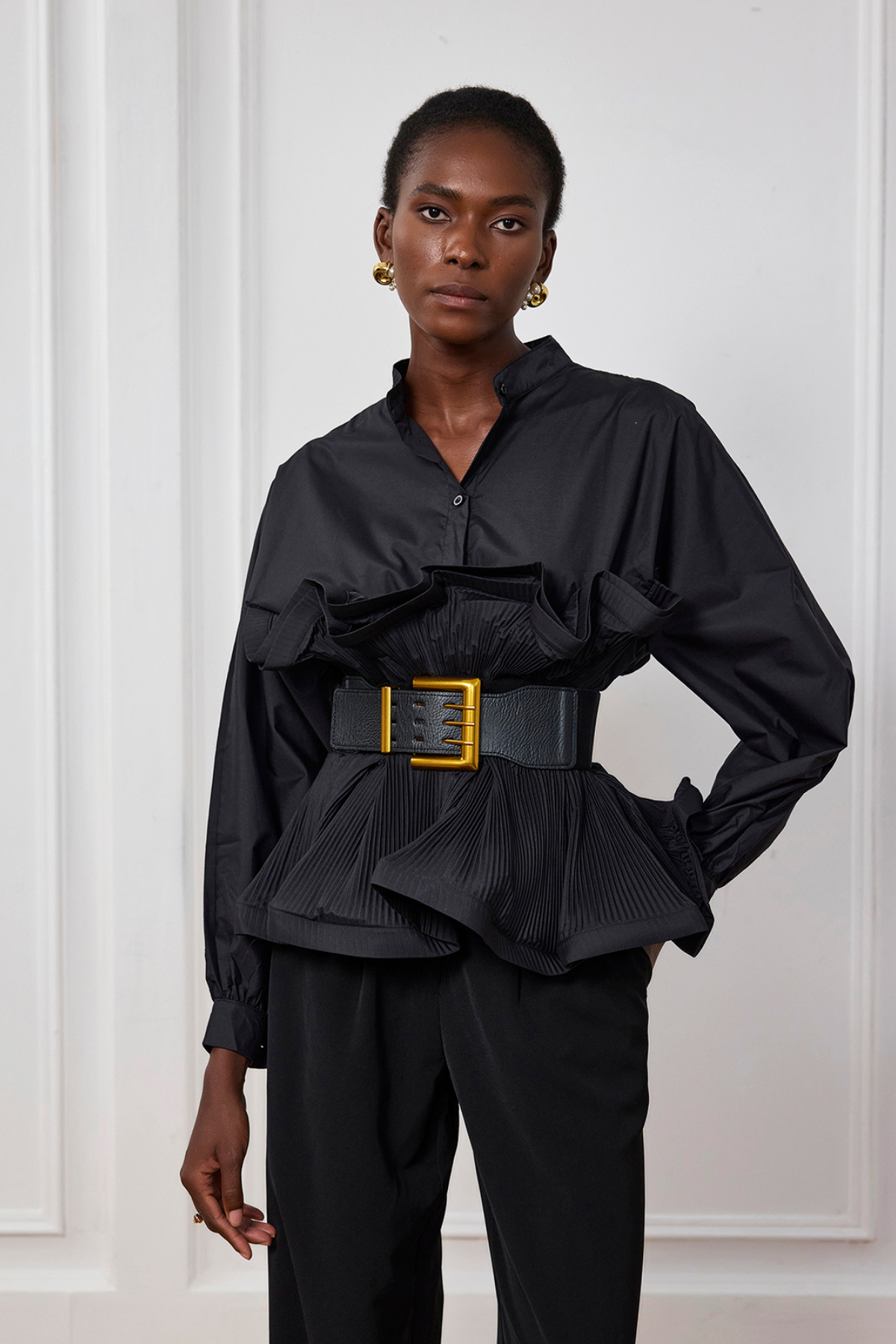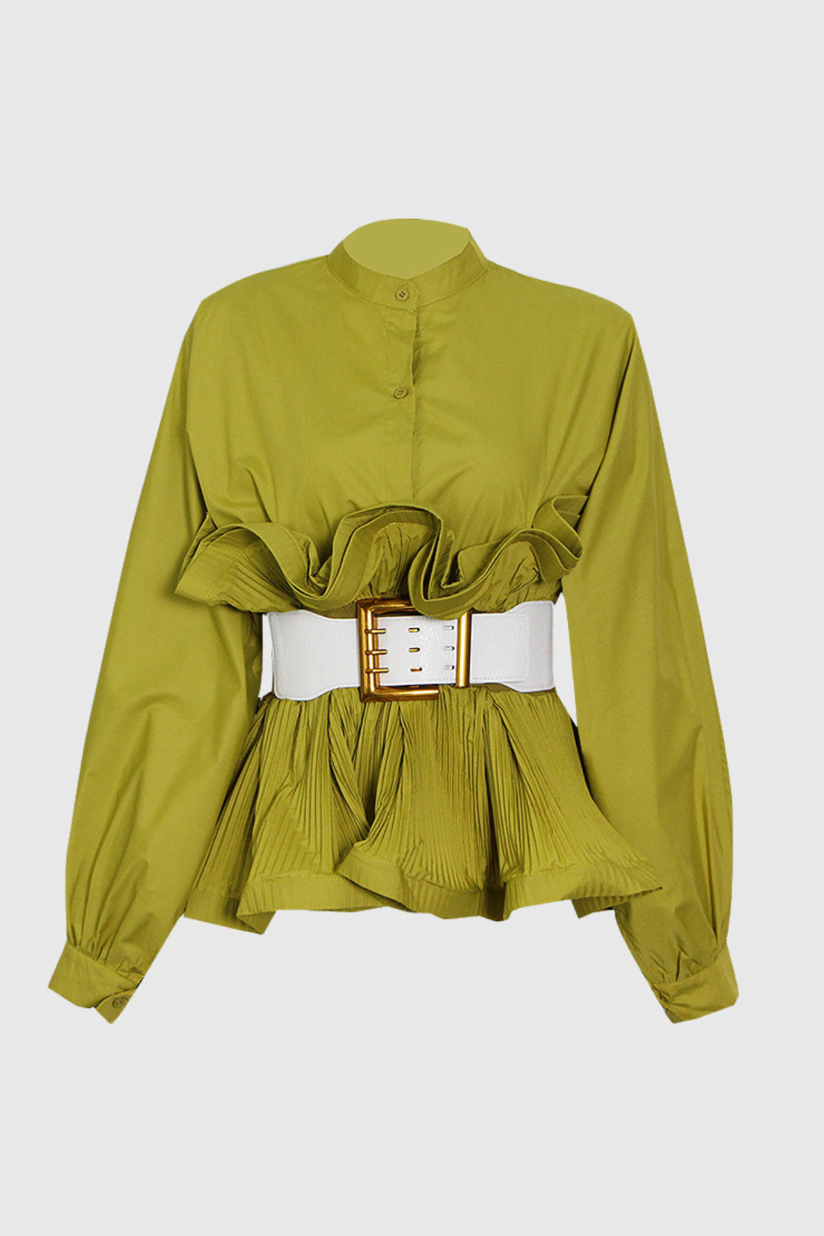 The Mazie Buckle Ruffle Ruch Shirt offers a stylish and feminine twist to your wardrobe. With its unique buckle and ruffle detailing. this shirt adds a touch of elegance to any outfit. The ruched fabric provides a flattering fit. making it comfortable to wear all day. Elevate your look with this must-have piece.