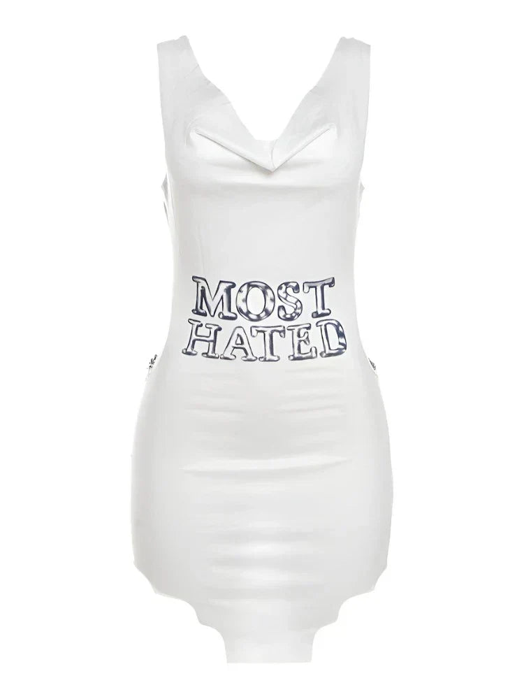 This stunning dress features a bold graphic print and a trendy backless design adorned with a sleek chain.