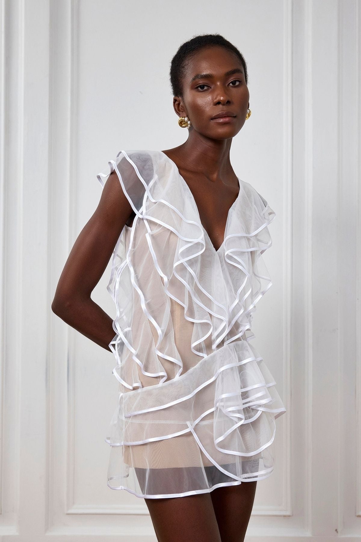 This Nancy Ruffle Mesh Sleeveless Mini Dress features a delicate ruffle detail and airy mesh fabric. creating a chic and flattering silhouette. Perfect for any occasion. this dress will elevate your style with its unique design and lightweight comfort. Expertly crafted for a polished look.