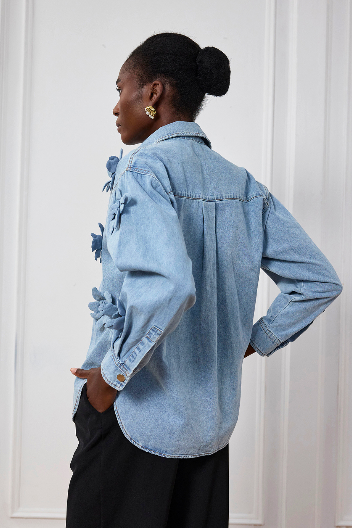 Introducing the Saoirse Flower Lapel Denim Shirt - a stylish and versatile addition to your wardrobe. Crafted with a unique flower lapel design. this shirt adds a touch of sophistication to any casual outfit. Made with durable denim. it's perfect for any occasion. Elevate your style with Saoirse.
