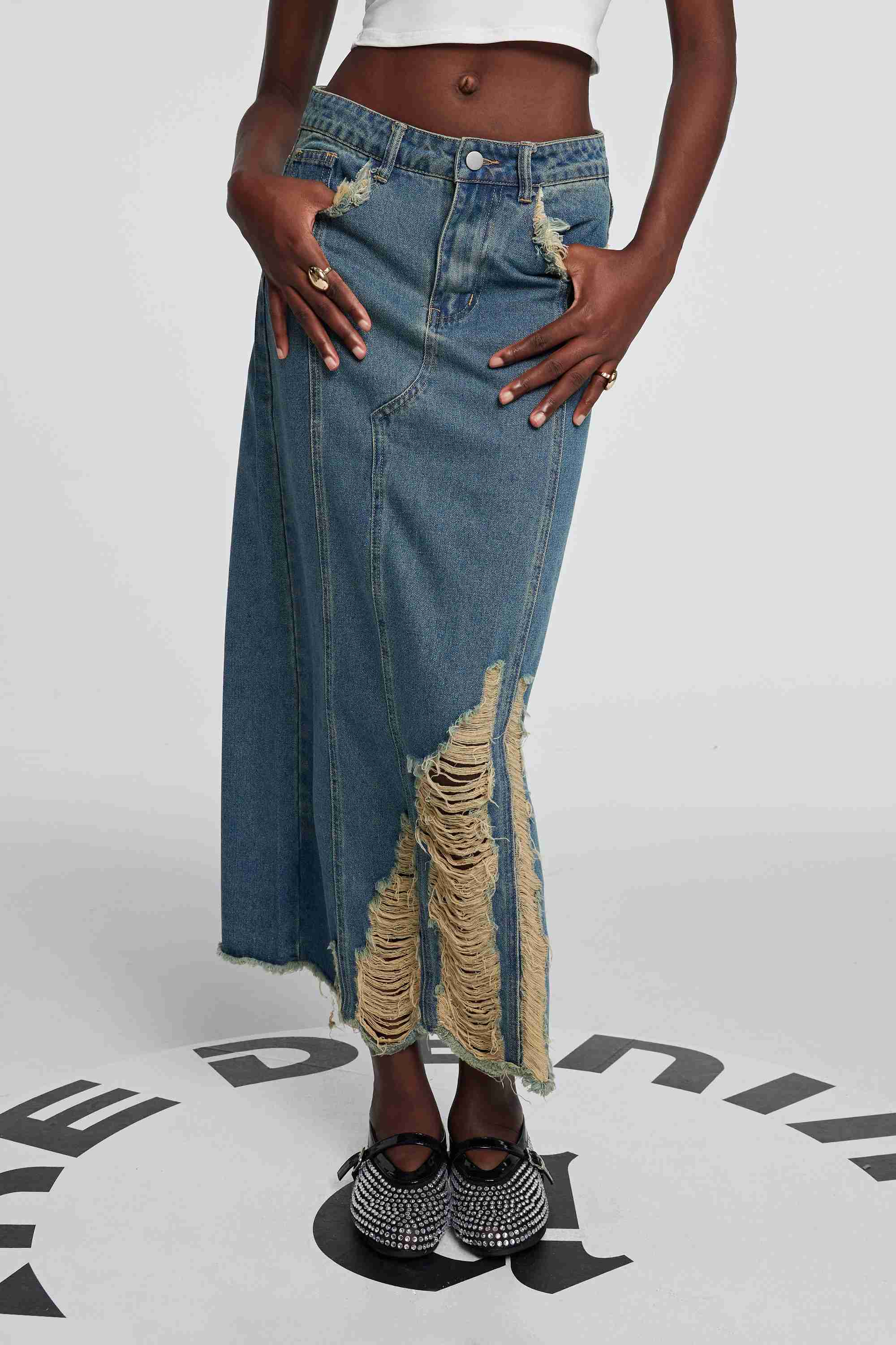 This Sharon Torn Denim Skirt is made with quality denim and features a unique distressed design that adds a touch of edginess to any outfit. The durable fabric and stylish details make it a versatile and long-lasting addition to any wardrobe.