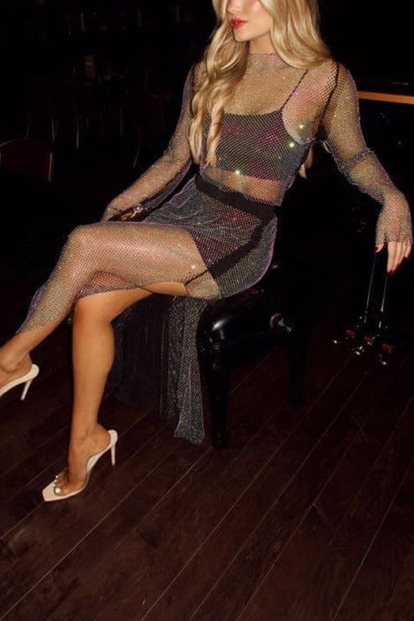 Experience contemporary glamour and get ready to turn heads in this Showstopper Top. Crafted from a stretchy yet soft fabric. this piece is adorned with rhinestone mesh that enhances its sparkle and shine. A standout piece for a concert or festival. this Top makes a statement and is an elevated must-have for the Eras Tour.