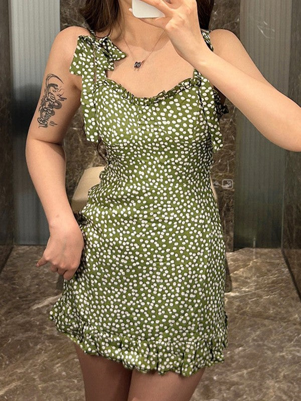 Description: Printed with polka dot allover. it has adjustable tank shoulder straps style. features frill trim. fully lined detail. and a smocked back with concealed zip fly design.