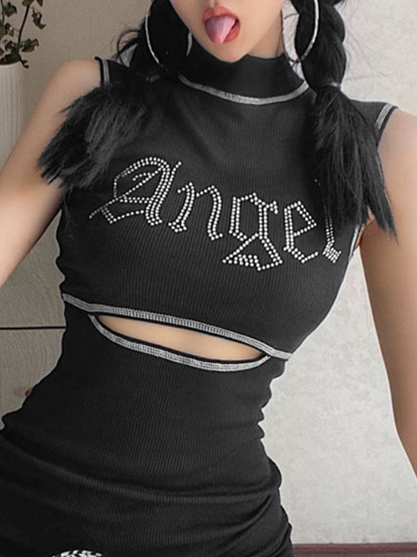 Description: This retro y2k girls mini dress is made from soft and stretch ribbed fabric. shaped to a bodycon silhouette. features rhinestone letter design. it has cutout on the front. and ended with contrast stitched details through the body.