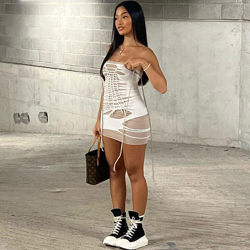 This little white dress exudes a semi-sheer style. having everything you need and more! Made of polyester and semi sheer mesh. embellished with distressed ladder cutouts. featuring a versatile neckline tailored with long straps. which can be casually flap down or tied up as the way you like. a slashed fitted silhouette accented with lace-up designs overlay. ending up in a short length. Find more trendy women's bandeau dresses or unique clothing in our boutique. and wear it with a layered necklace. thigh-high heels and a crossbody bag for a striking look.