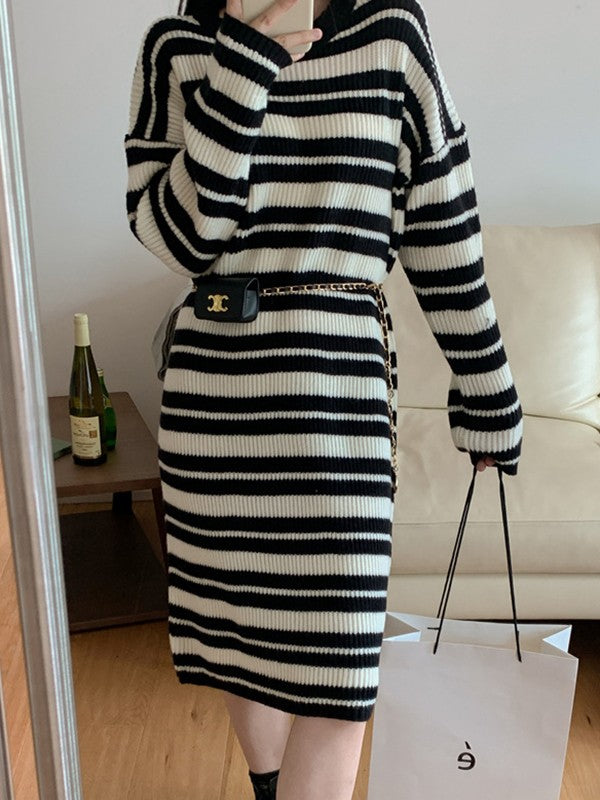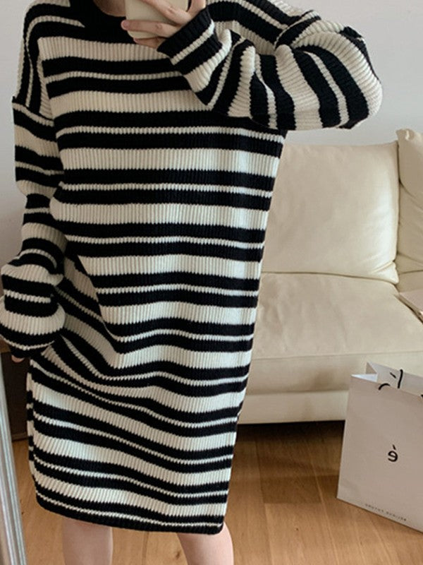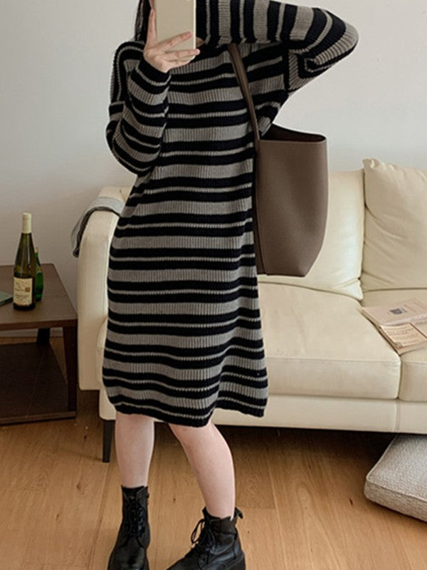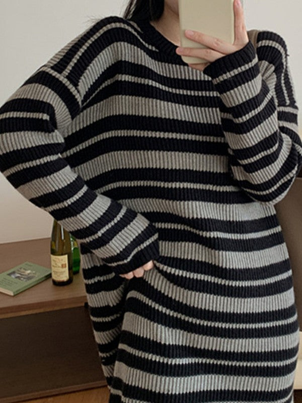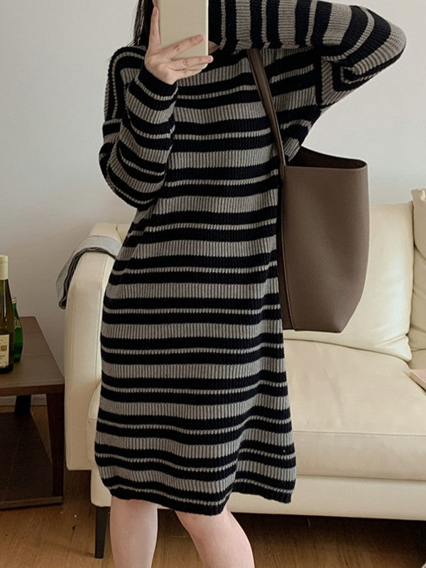 Description: This staple but retro long dress cuts to a relaxed silhouette. features contrast striped pattern allover. and has dropped long sleeves design.
