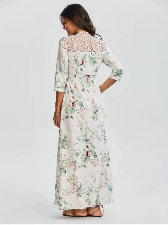 The Dress featuring with sexy lace panel at back. surplice shape. high slit design in front. nearly floor lengh. and full flowers print for a fresh style.