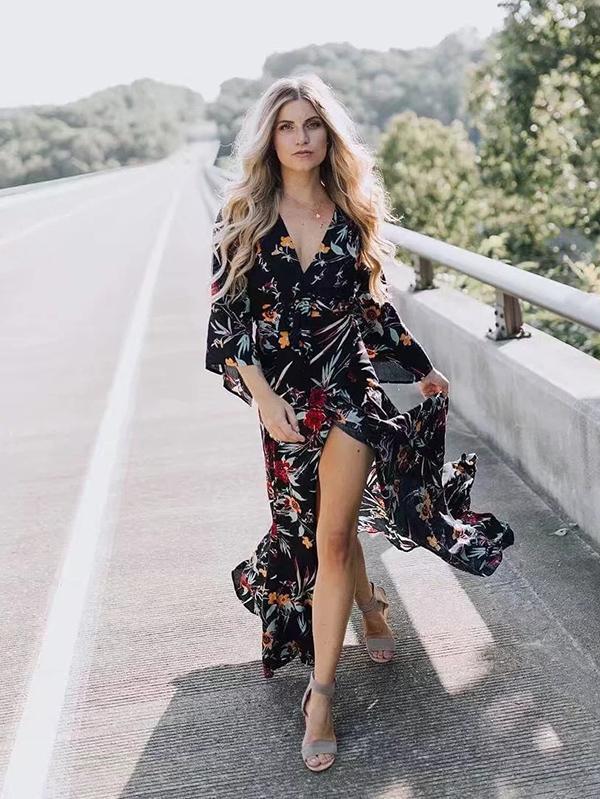 Insrs - V-neck Split-side Belted Bohemia Dress