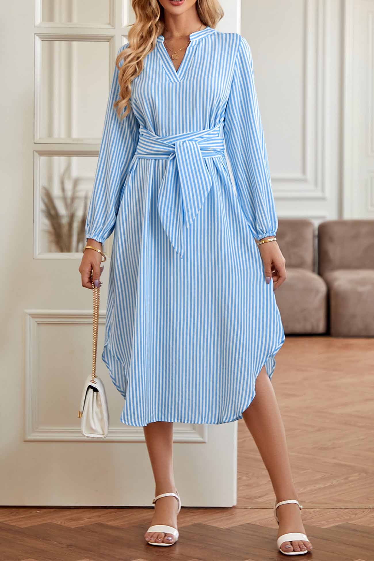 V Neck Striped Tie Waist Long Sleeve Midi Dress